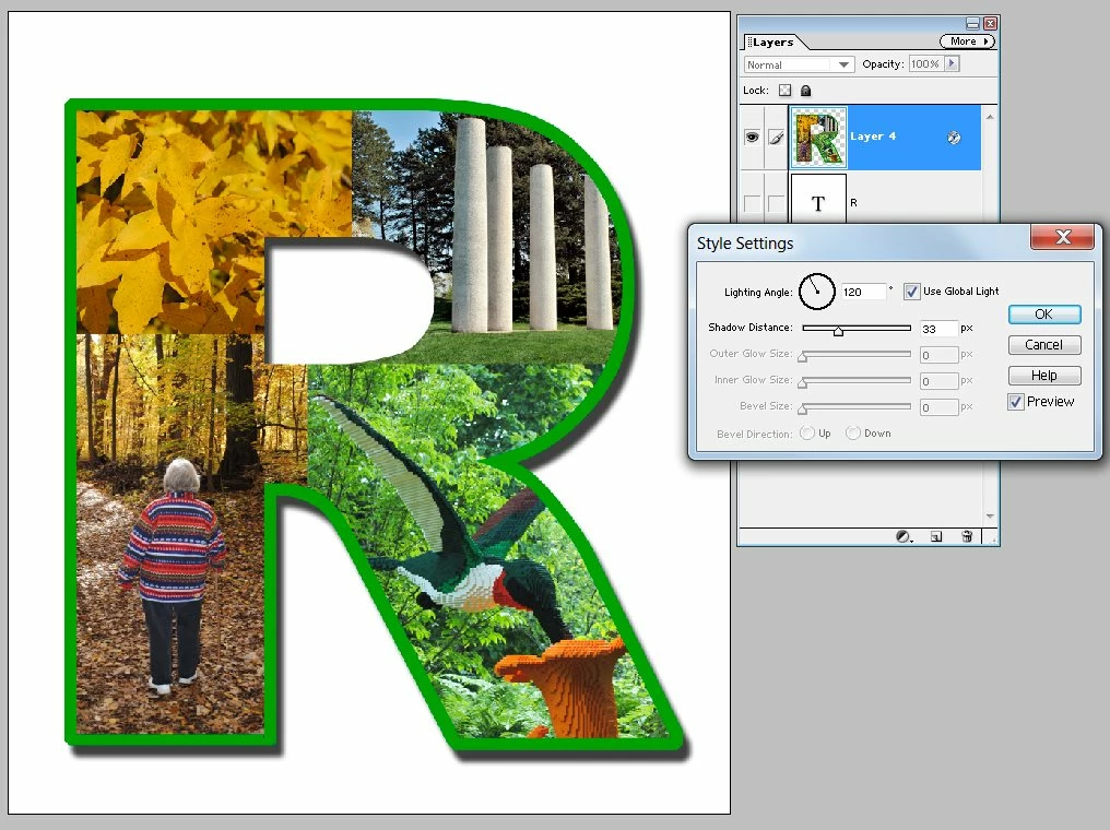 9. Now for the drop shadow. Open the Layer Styles window and select Drop Shadows from the pull-down list. I chose the Low drop shadow. The default shadow size is rather small. If you want a larger shadow click the small "f" icon on the R layer to open the Layer Styles window. Check the Preview box, and move the Shadow Distance slider to get the size you want.