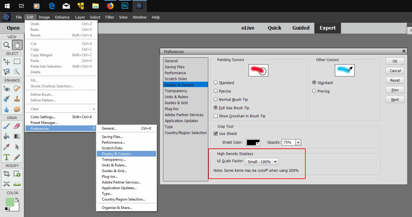 I have just installed Elements and the size of the menu icons is tiny. I would like to know how to make them larger. Changing things like the screen resolution of the laptop has no effect