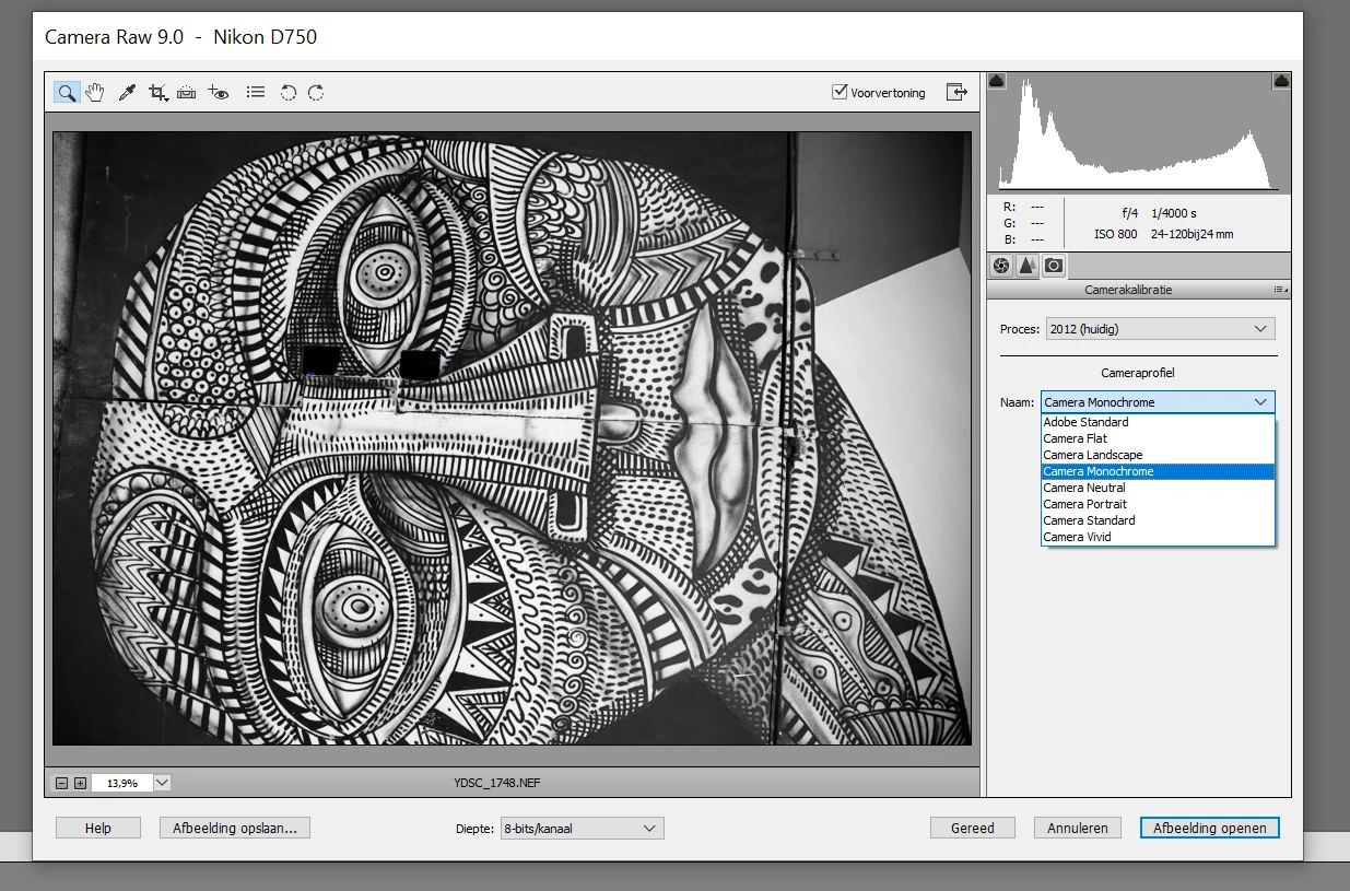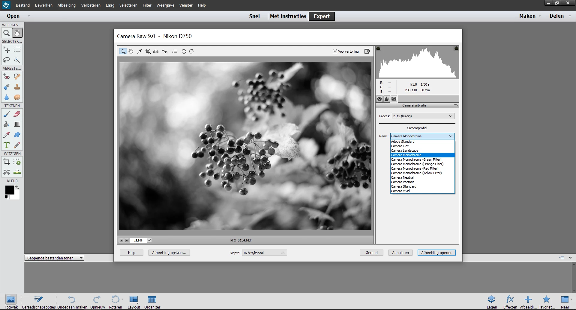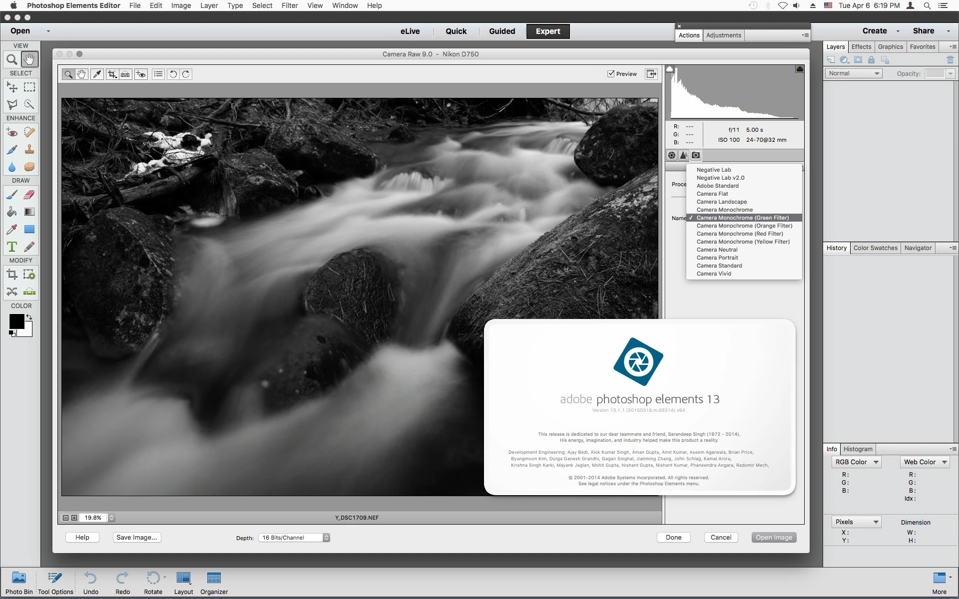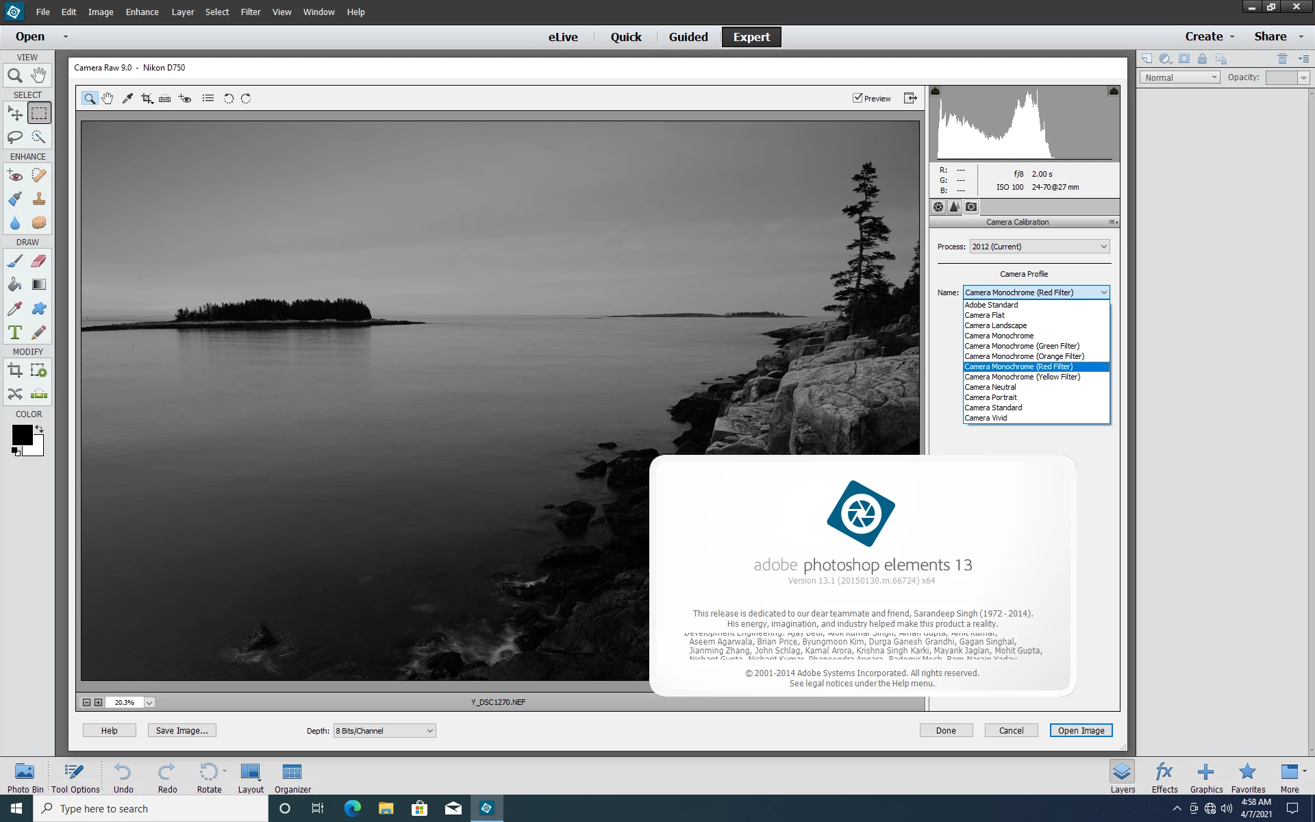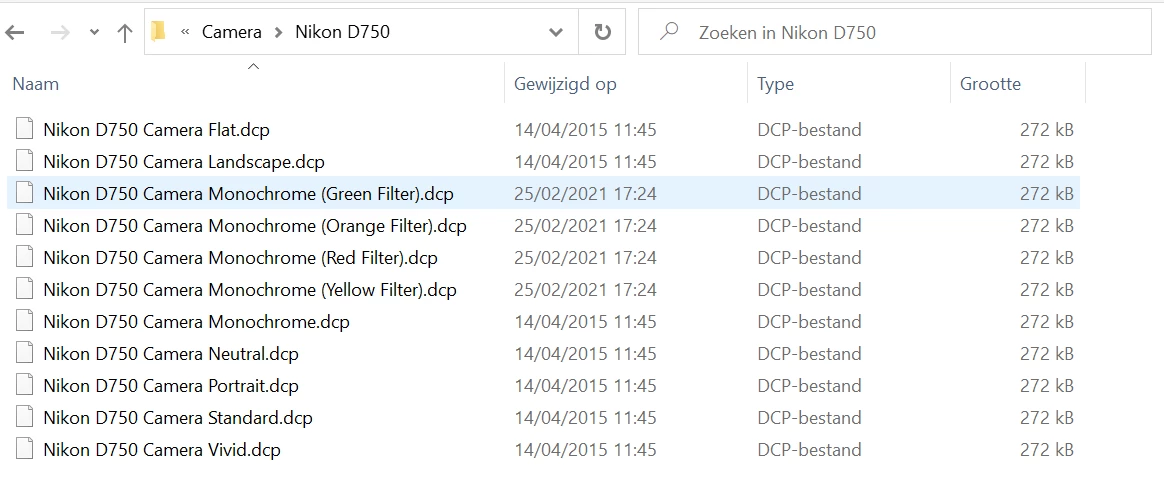 Since then the camera profiles: monochrome yellow, monochrome orange, monochrome red, monochrome green are missing in the Camera Raw dialog box. I am 100% positive Camera Raw did support these files for my Camera before I reinstalled Photoshop Elements 13.