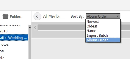 Photos in a folder or album are arranged according to the Sort By dropdown menu shown in my first screenshot above.  The choice of Album Order is only available if you select an Album for viewing.  You can manually change the order of photos in an Album, using the Album Order.  Simply click and drag the thumbnail to a different position in the grid.