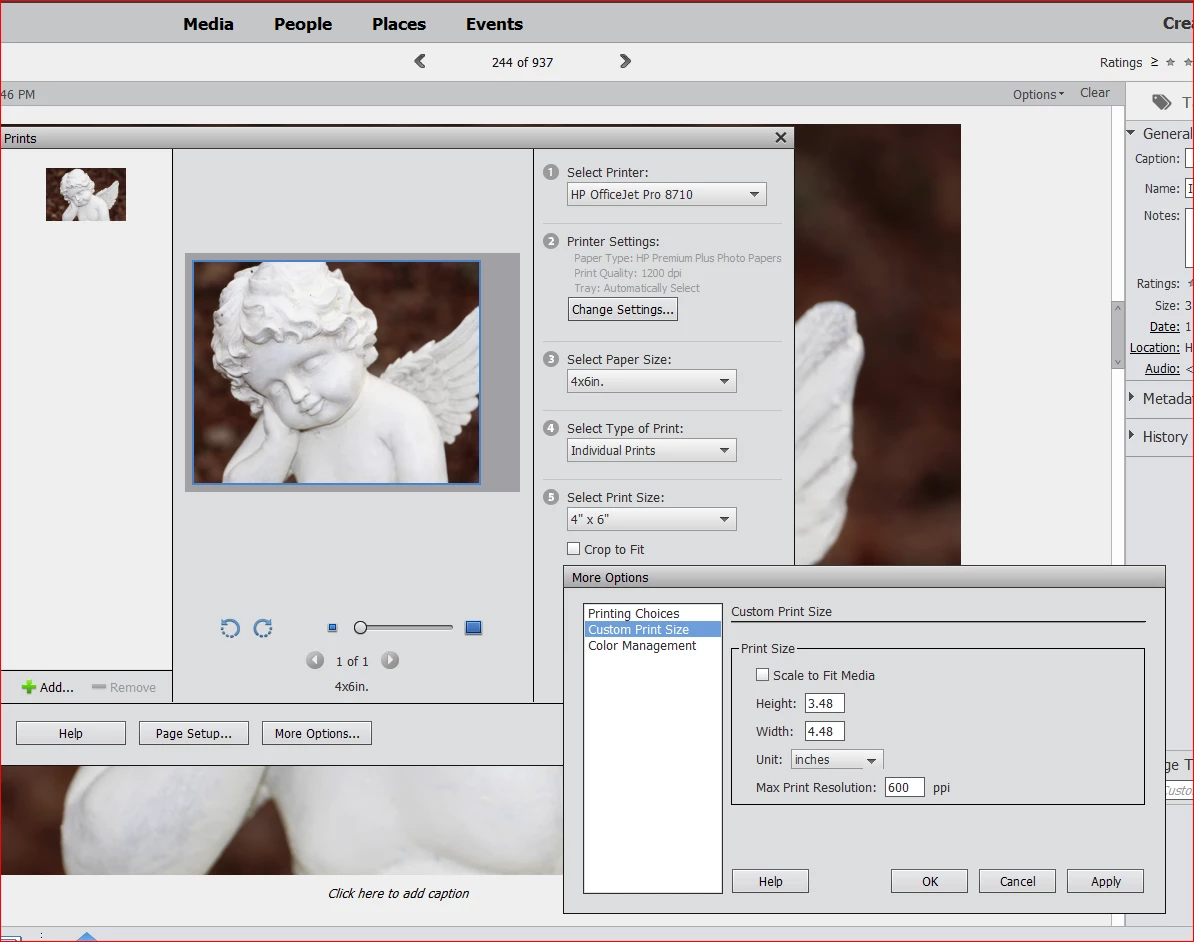 Hi, I'm trying to print 4 x 6 borderless photos from Adobe Photoshop Elements 2019 to my HP OfficeJet Pro 8715 printer. I can't find borderless settings (which my printer may not have) but it's not even printing a full 4 x 6 with a border, see the wide gray area on the side and the custom settings won't go larger than 3.48 x 4.48 for some reason. I had the same printer in an 8600 prior to this one and I didn't have this problem then. Any help would be appreciated! Or any recommendations for a good printer that will print 4 x 6 and other size photos borderless. Thank you in advance!