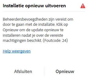 Andere keer: Installatie opnieuw uitvoeren - Foutcode 24. Deze foutcode staat niet vermeld in de lijst met foutcodes van Adobe.