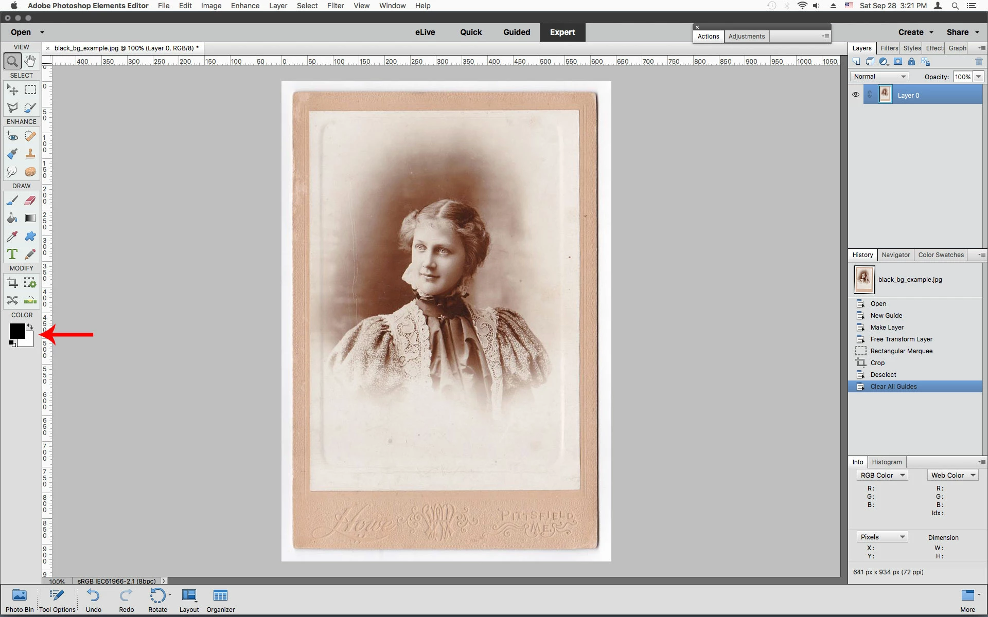 I use Photoshop Elements Photo Editor to edit scanned photos for listing on eBay. Recently my laptop crashed and now when I open a scanned image it has a white background - but if I rotate the image to get it straight, there is a black background revealed. I know I can use straighten and crop, but I want to be able to crop the photo with space around the edges so the buyer can see there is no damage to the edges - and I don't want that black bg getting in the way. In the example below, I can still crop with only white showing, but sometimes I can't. I'm guessing this has something to do with Layers? but I have no Photoshop training, and can't find a way to fix it.