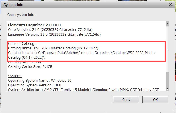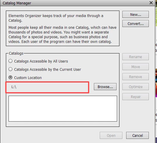 I keep active catalogs on an external drive. I keep catalog backups on another external drive. One catalog's structure I do not like, want to correct. First, it appears in both "Custom Location" AND "All Users". If I open that catalog name in custom location, many photo thumbnails have no pictures. If I open the exact same name in all users, ALL photos appear, and are connected to source files - only -- some are stored on that desired external drive, even more are stored on the computer's C drive, and I do not want this, want to consolidate ALL onto the external drive. SO: I opened the all users catalog, confirmed all photos connected to source files (in either one, or the other location, as mentioned) - and ran a full backup, to the external "backup" drive (successfully - no messages about need to reconnect photos) - THEN I restored to the other external drive (for active catalogs), but to a new folder/new location. Backup ran successfully -- BUT -- when opened (either in Organizer, or directly from the "catalog.pse21db" file) the catalog has MANY thumbnails without photos (like the catalog I mentioned in "custom location"). NOW, I looked, and in the Adobe location on C drive, found that catalog - opened it from the "db" file, and the correct catalog DID open, with all photos linked.