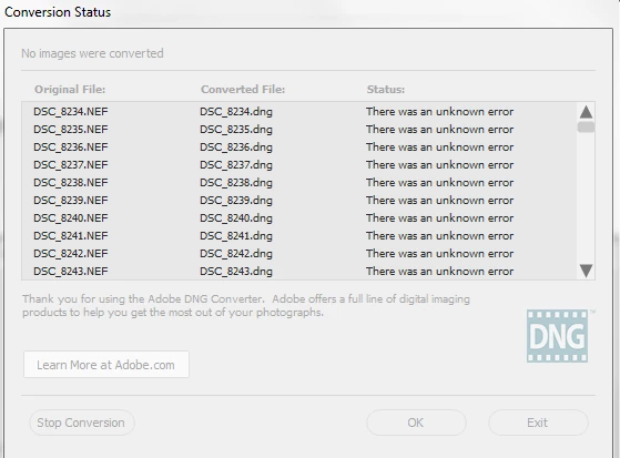 NEF to DNG - unknown error (only photos from old manual lens on adapter)