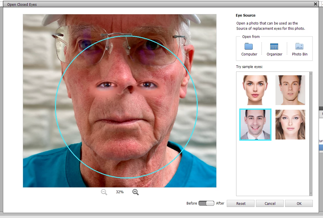 No faces found in selected photo with "open closed eye" tool