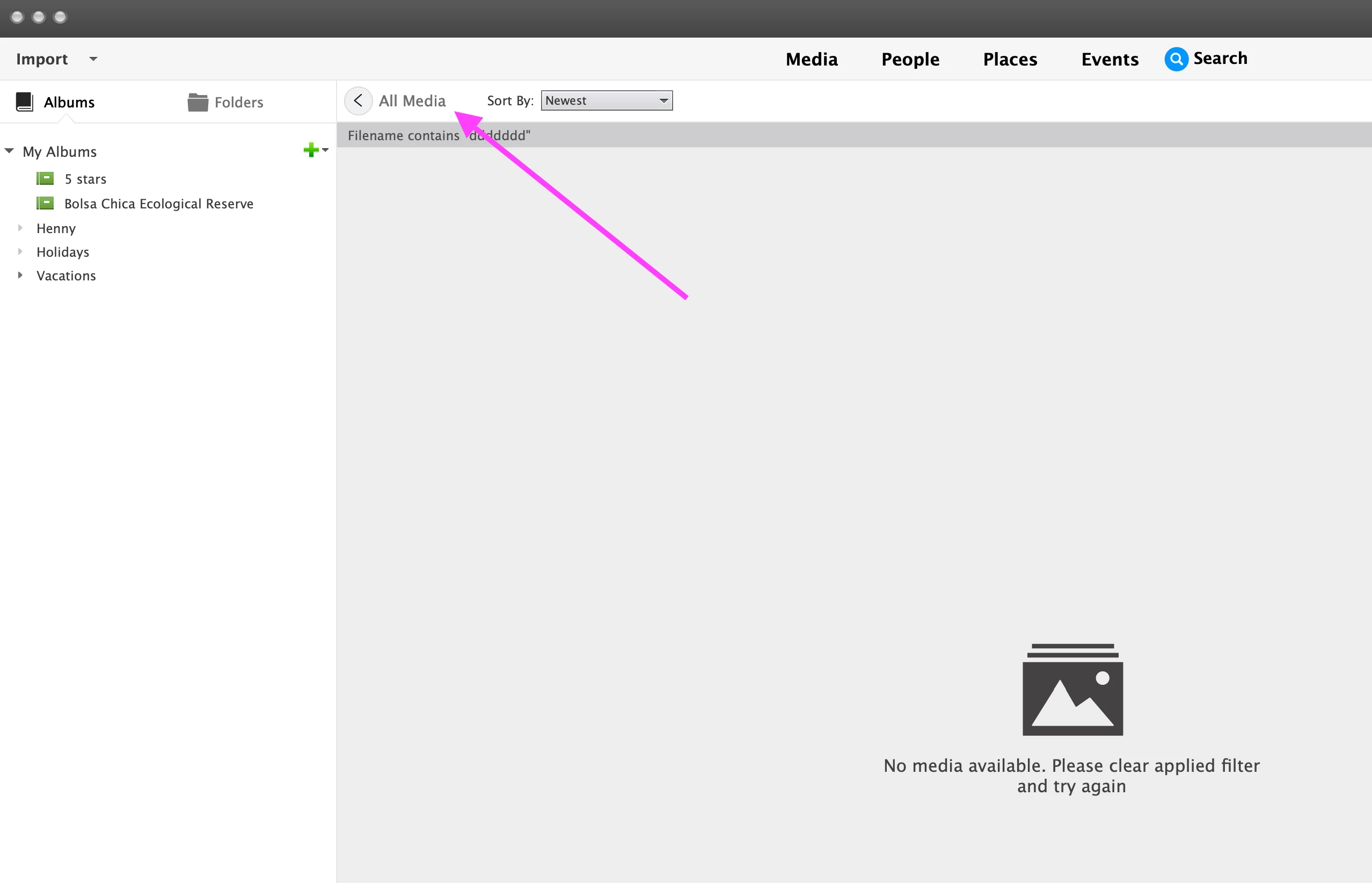 I have lost the photoes on the media paine. a note states: No media available. Please clear filter and try again. There are not filters checked in the tags, where else would I find a filter to clear?