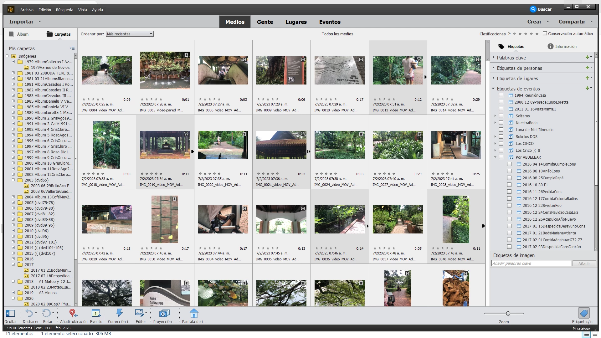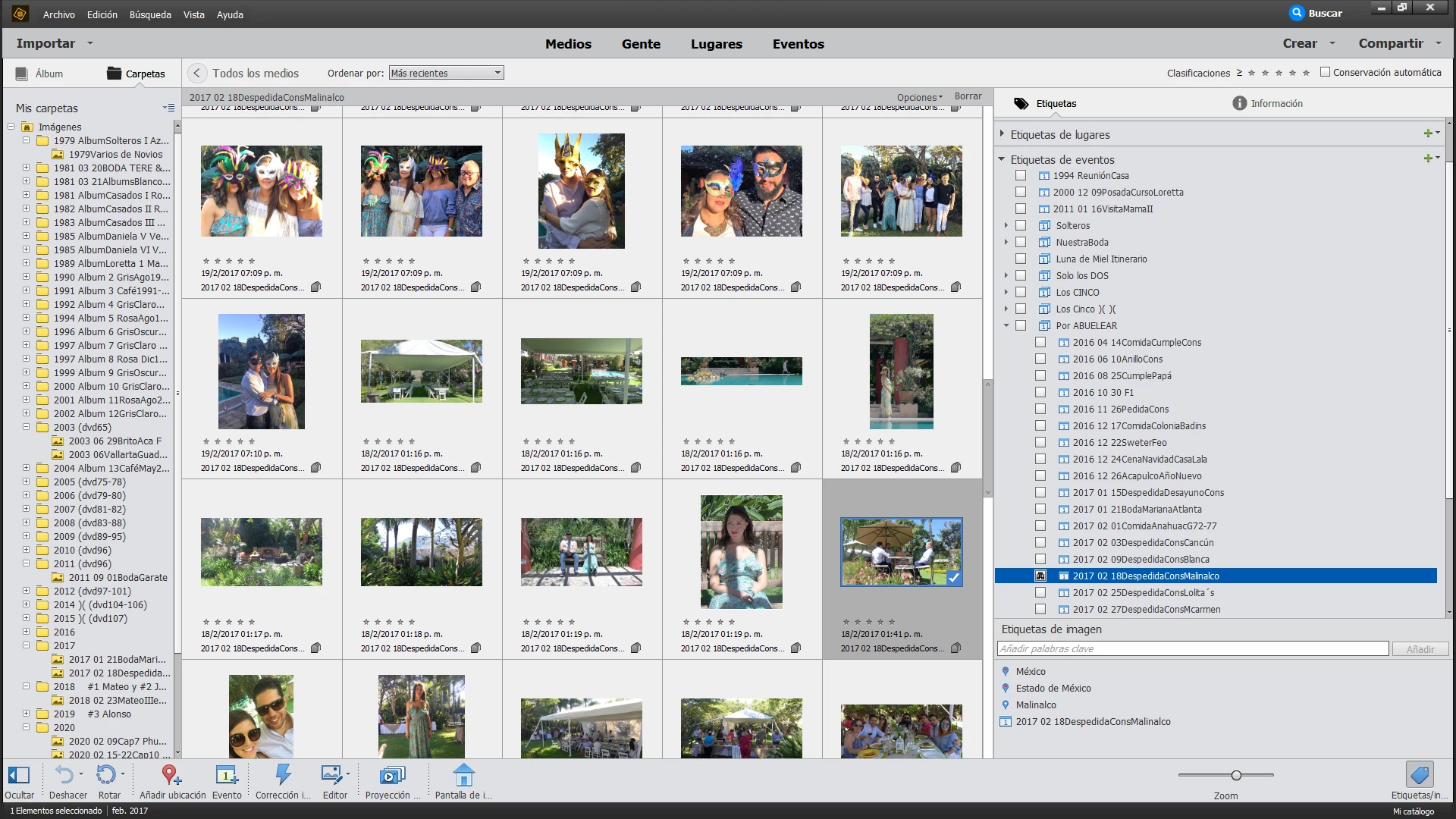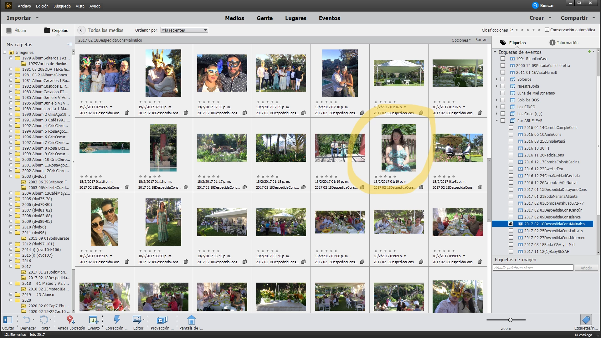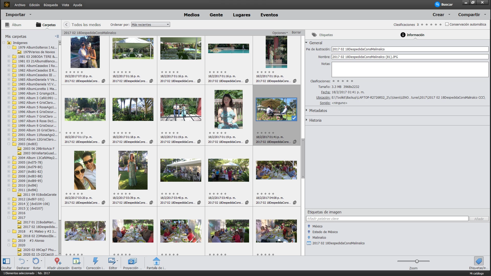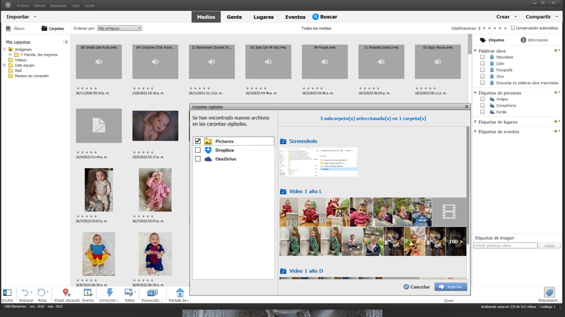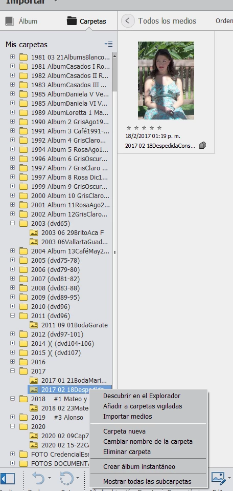 Al cancelar este intento de backup, las carpetas en Mis carpetas del lado izquierdo de la plantilla de trabajo del APEO, se desconectaron. Cerré y abrí el APEO. Al abrir se empezaron a cargar las fotografías de cada carpeta, pero no cargó la totalidad de las carpetas. Sin embargo, aparentemente sí aparecen las fotografías faltantes en la parte derecha en las Etiquetas en todas sus variantes.