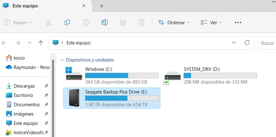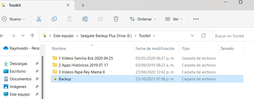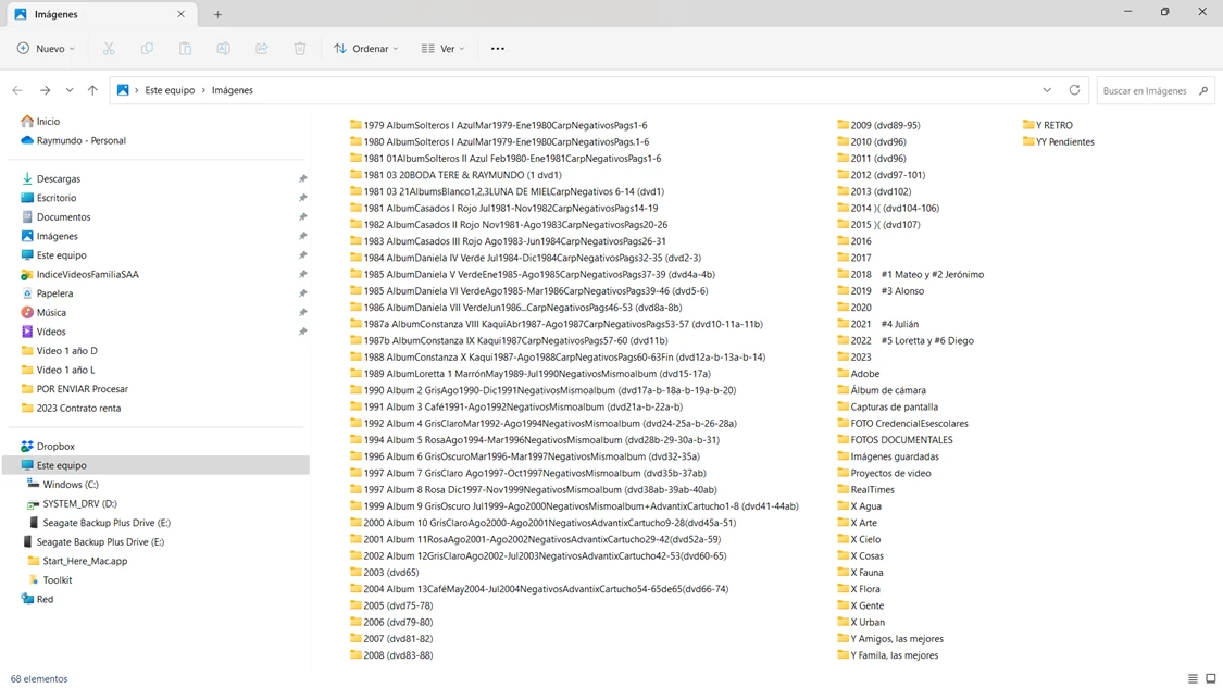 • Backup of My Pictures/Imágenes/Fotos file, are made one manually on an external drive (ADATA No. 1,1TB) and the other, continuously in another external drive permanently connected to my PC (Seagate Backup Plus Drive 5TB).