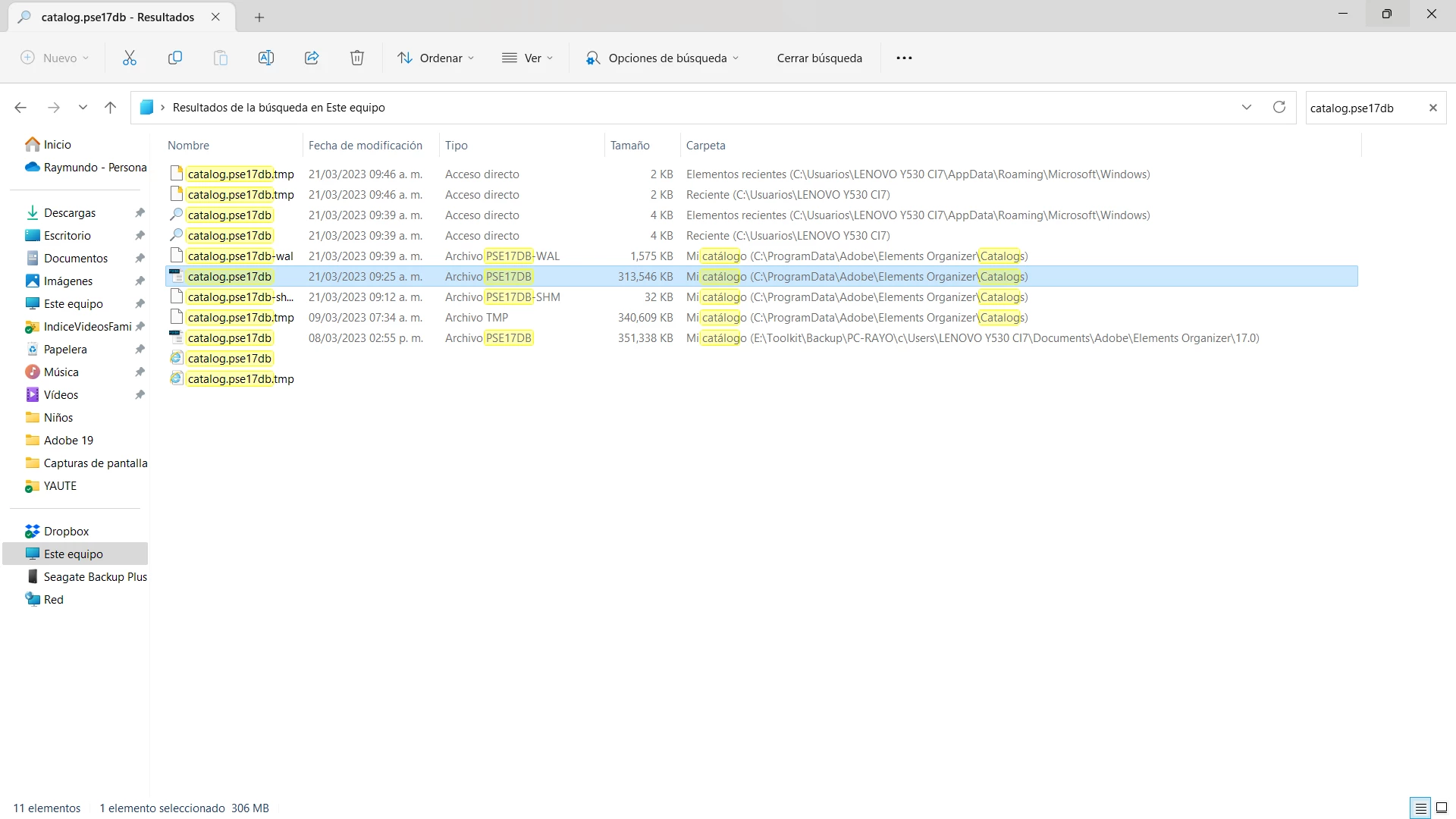 Diciembre 2022. Se hizo una copia de seguridad exitosa del catálogo Adobe Photoshop Elemens Organizer 2019, en disco duro externo de 1TB.