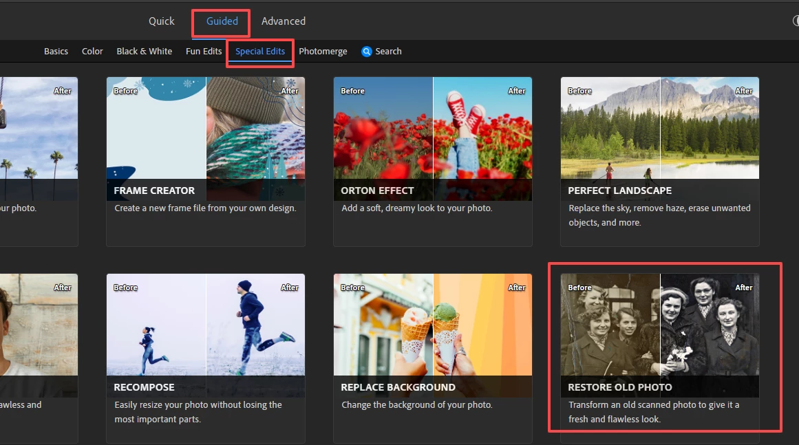 Now having gone through all these steps, I have remembered that Elements actually has a Restore Old Photo Guided Edit which will guide you through using these tools and others.