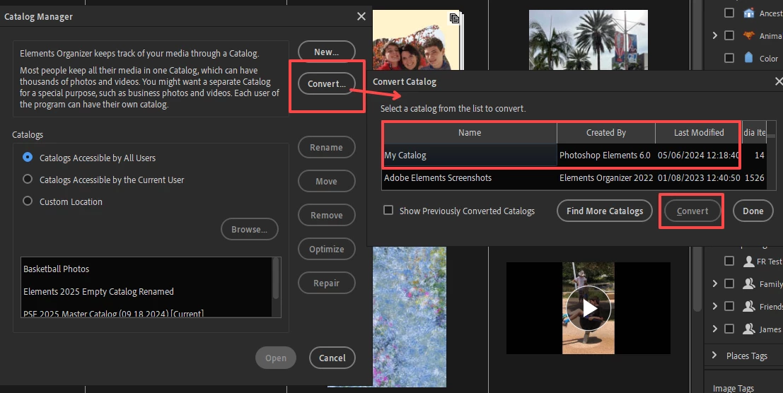 wegen der Migration auf Win 11 musste ich auf neue HW umziehen. Dort habe ich Photoshop Elements 2025 installiert. Alle Medien und alle Kataloge (6) habe ich migriert. Beim Einrichten habe ich festgestellt, dass der Katalogmanager von allen meinen Katalogen nur einen erkennt und zum Laden anbietet. Alle anderen werden nicht angezeigt, obwohl sie in dem betreffenden Katalogdirectory vorhanden sind. Dies gilt sowohl für die Kataloge im alten Elements 22-Format als auch für die schon ins 25er-Format konvertierten (die Konversion habe ich noch auf meinem alten PC gemacht). Eigentlich sollten die alle im Katalog Manager sichtbar sein.