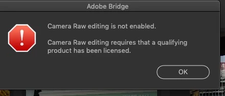 Noticed that if from Bridge I use "Open in Camera RAW" instead, I get the error as shown in second attachment.  Not sure if this is related.