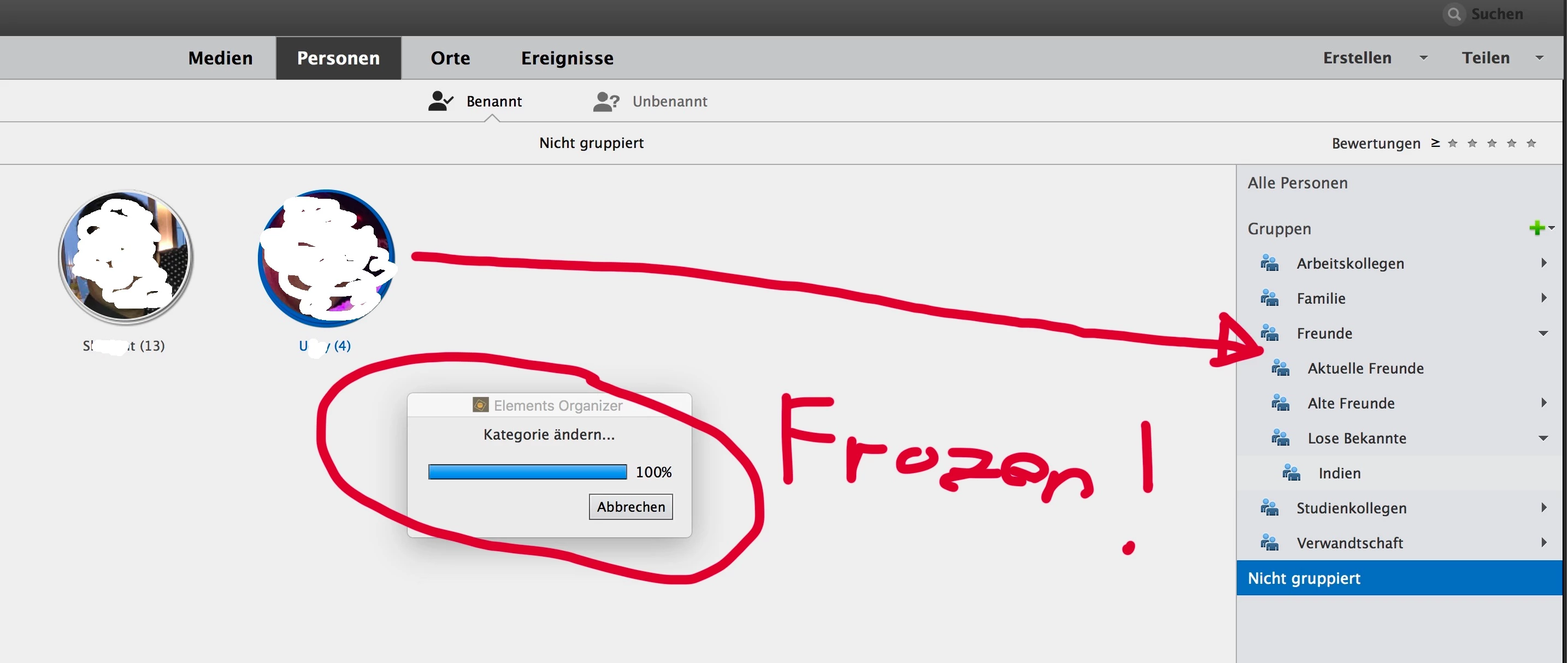 Moving a person (4 pics) from the person area to one person folder at the right (e.g. friends), the popup shows 100% but nothing happen, frozen. Cancel does not work, menu to exit is not available, etc.