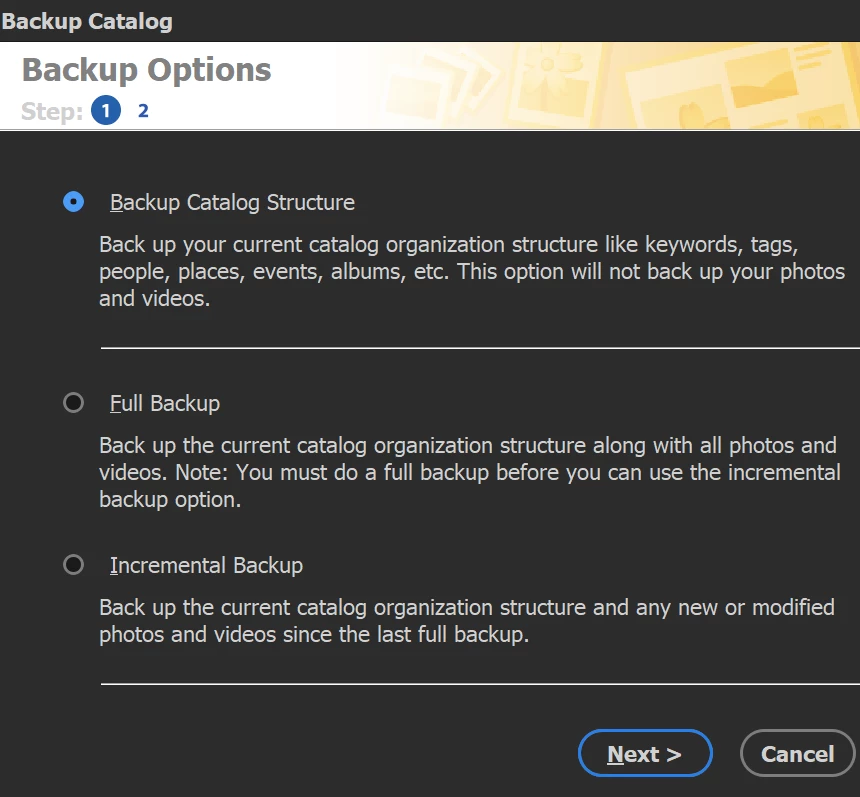 An Organizer question. I sometimes get this when I open Organizer - “Auto backup of catalogue structure”. What is this? Is it worth doing? It does not apparently backup the actual pictures so what does it do? Currently, every so often I do a full backup of 160,000 pictures with tabs and albums, using external hard drive.