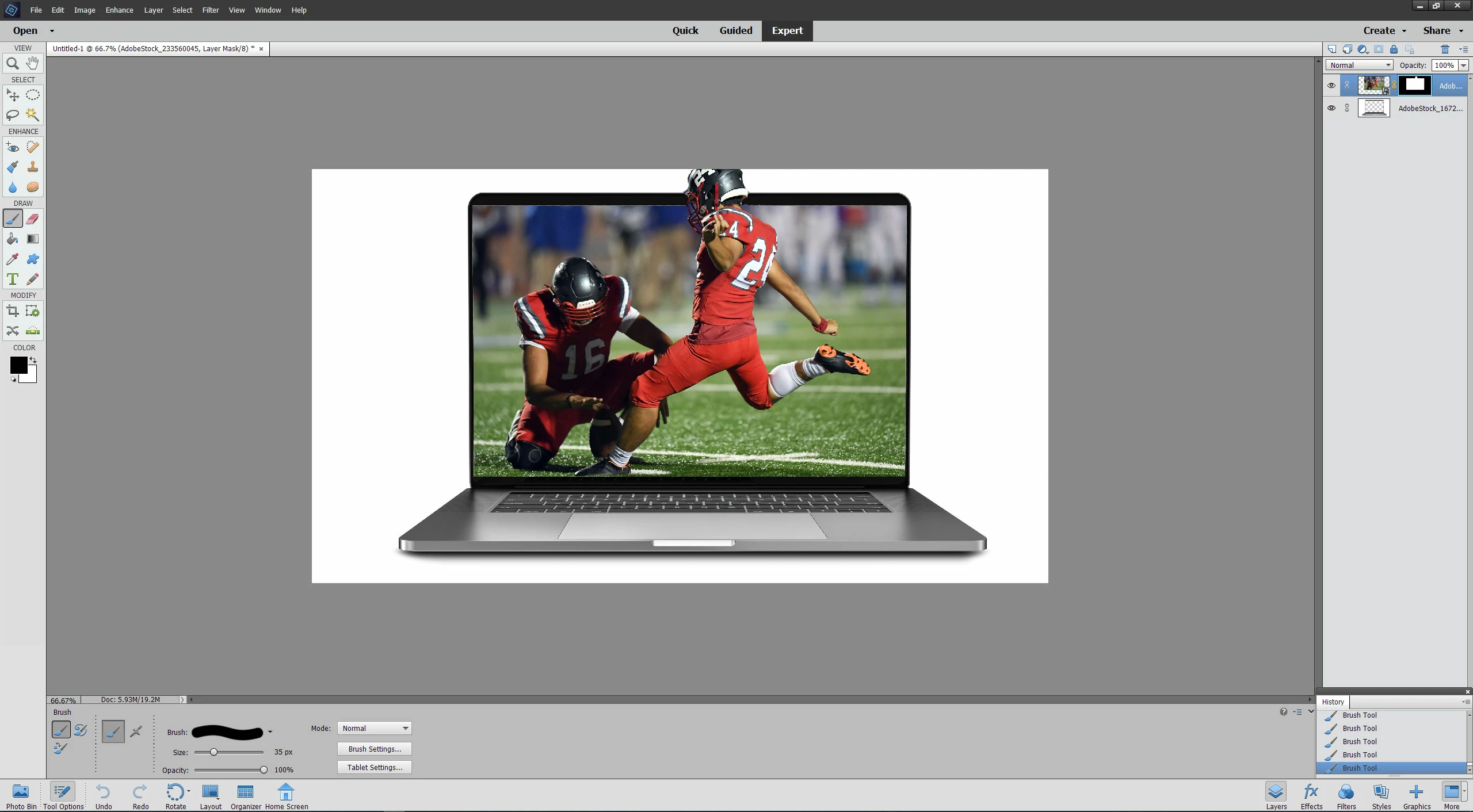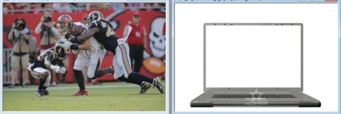 I’m teaching myself how to use masks in Photoshop Elements 18. To get started, I followed an example in the book “Photoshop Elements 15 for Digital Photographers.” I learn a lot from the book as a tutorial, but it doesn’t treat topics in depth, so it always leaves me with questions. In this example, the author has a photo of football action and an image of a laptop screen: