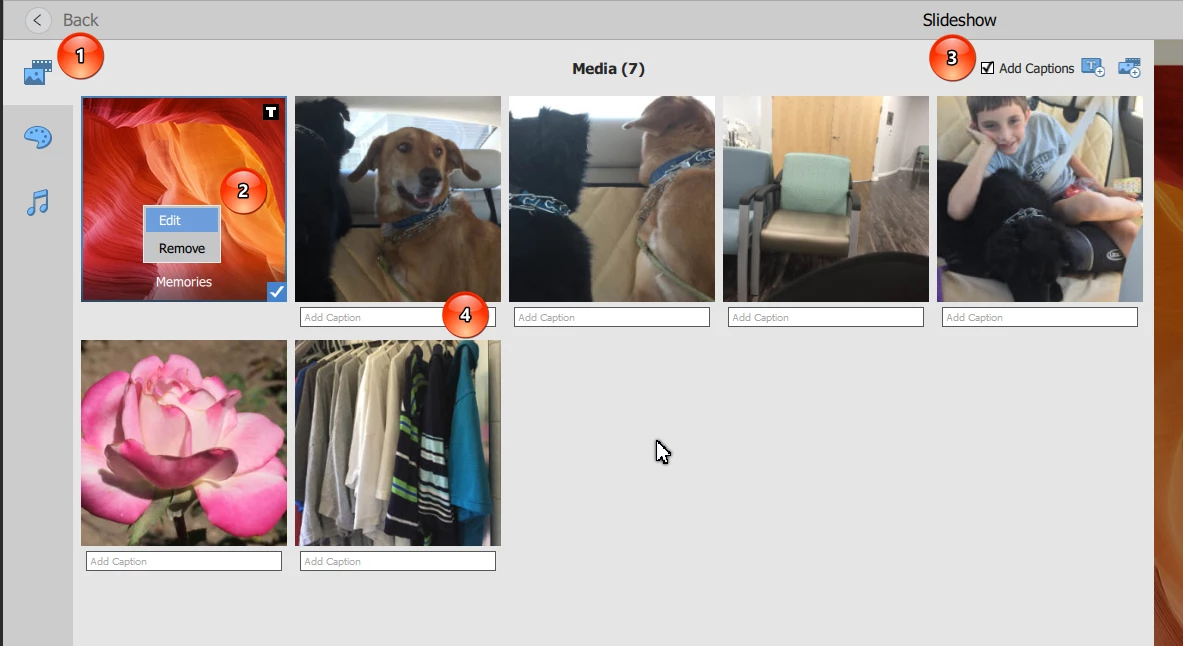 1. Click on the Media tab at the top left of the Slideshow Editor. You should see something like my screenshot.