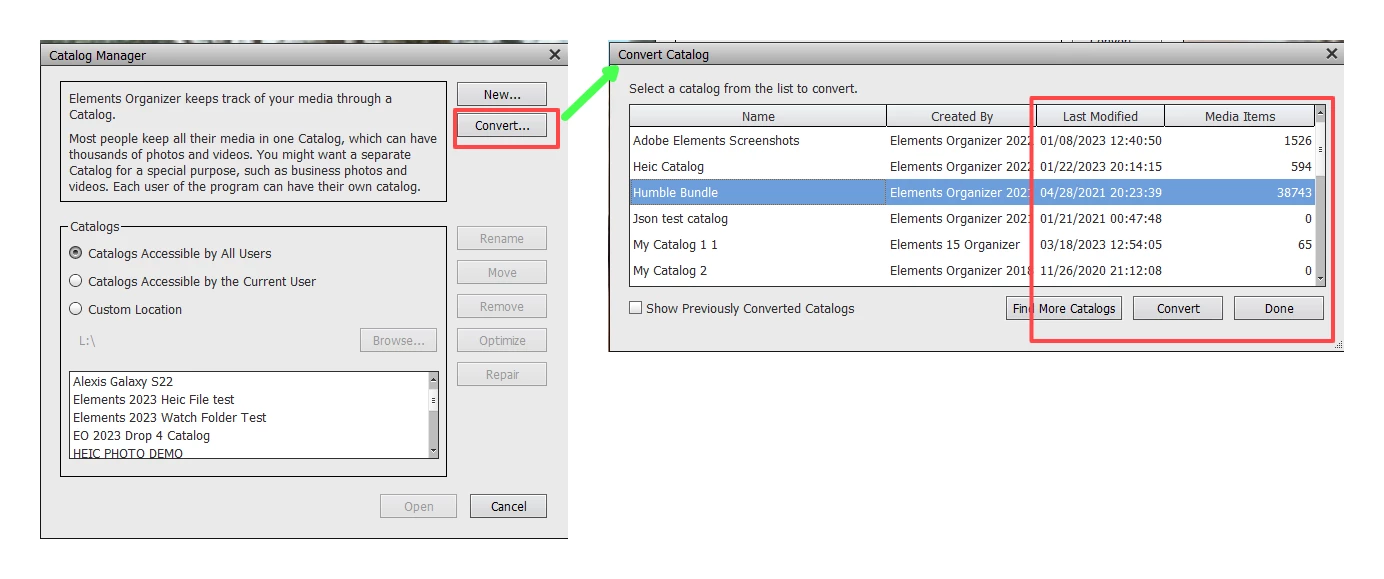 As you will see in one of the messages, your converted Elements 2022 catalog will be renamed with a -1 suffix. You will still be able to use this renamed catalog in Elements 2022.