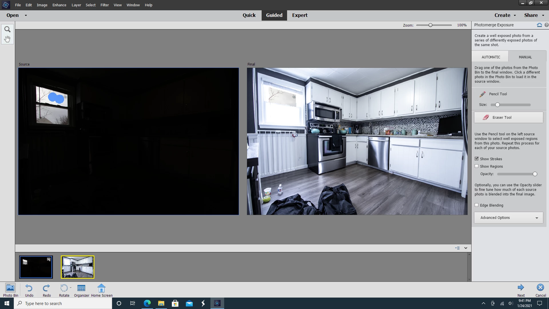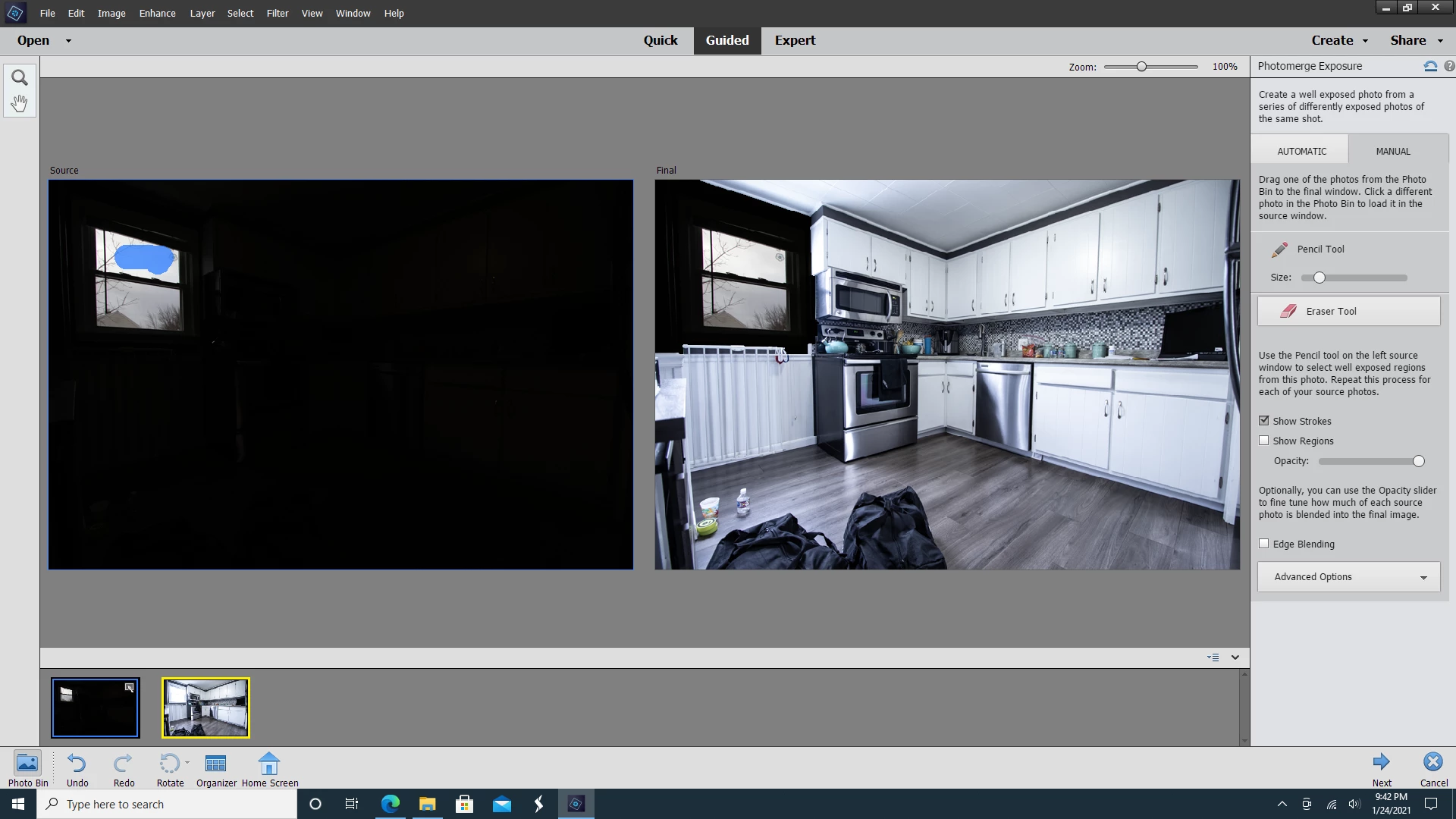 I'm still learning and I am trying to fix the blown out window issue in my photo. I have the over exposed photo and with under exposed. When I merge the photos and manually paint the window, the entire window eventually turns very dark. Why is this happening and how can I prevent it? (Dont't mind my kids hockey bags in the photo!)
