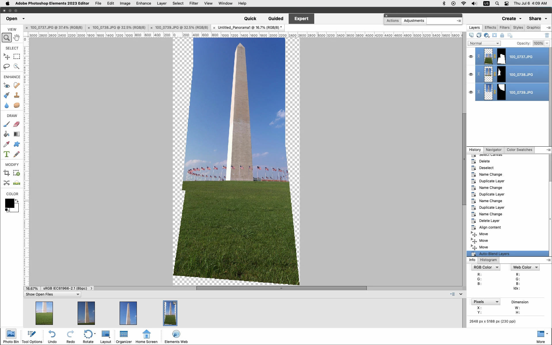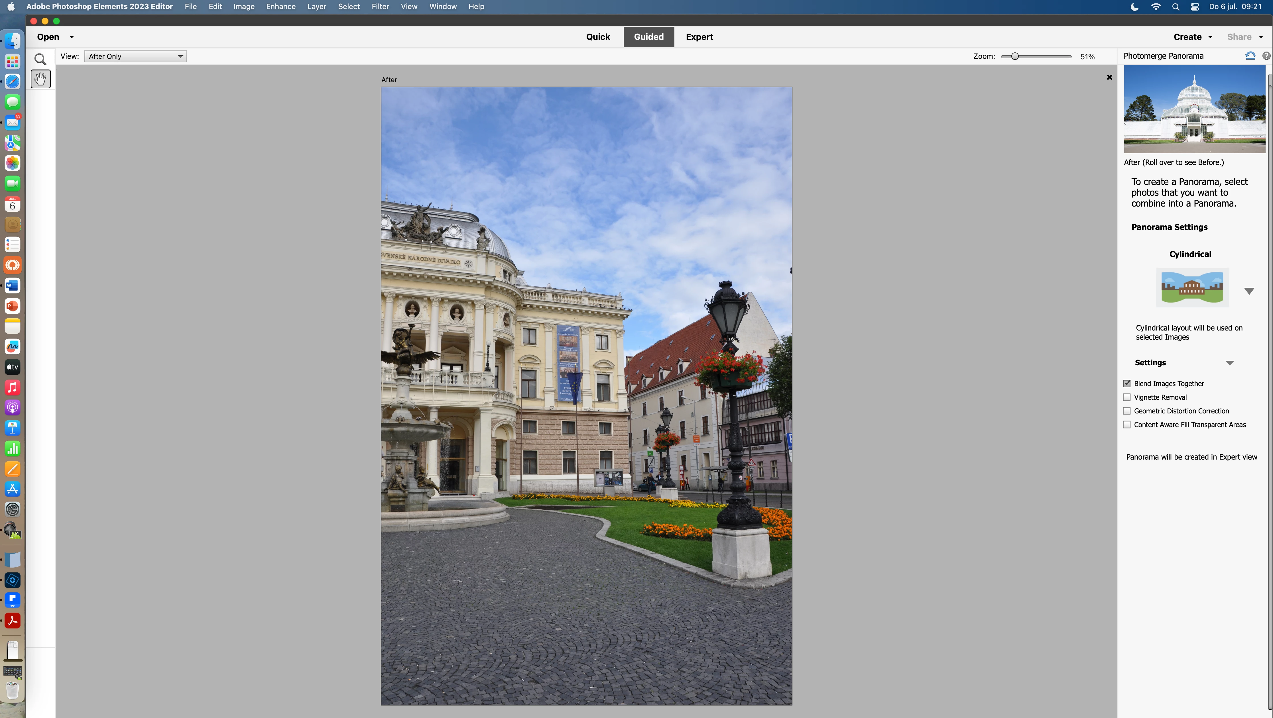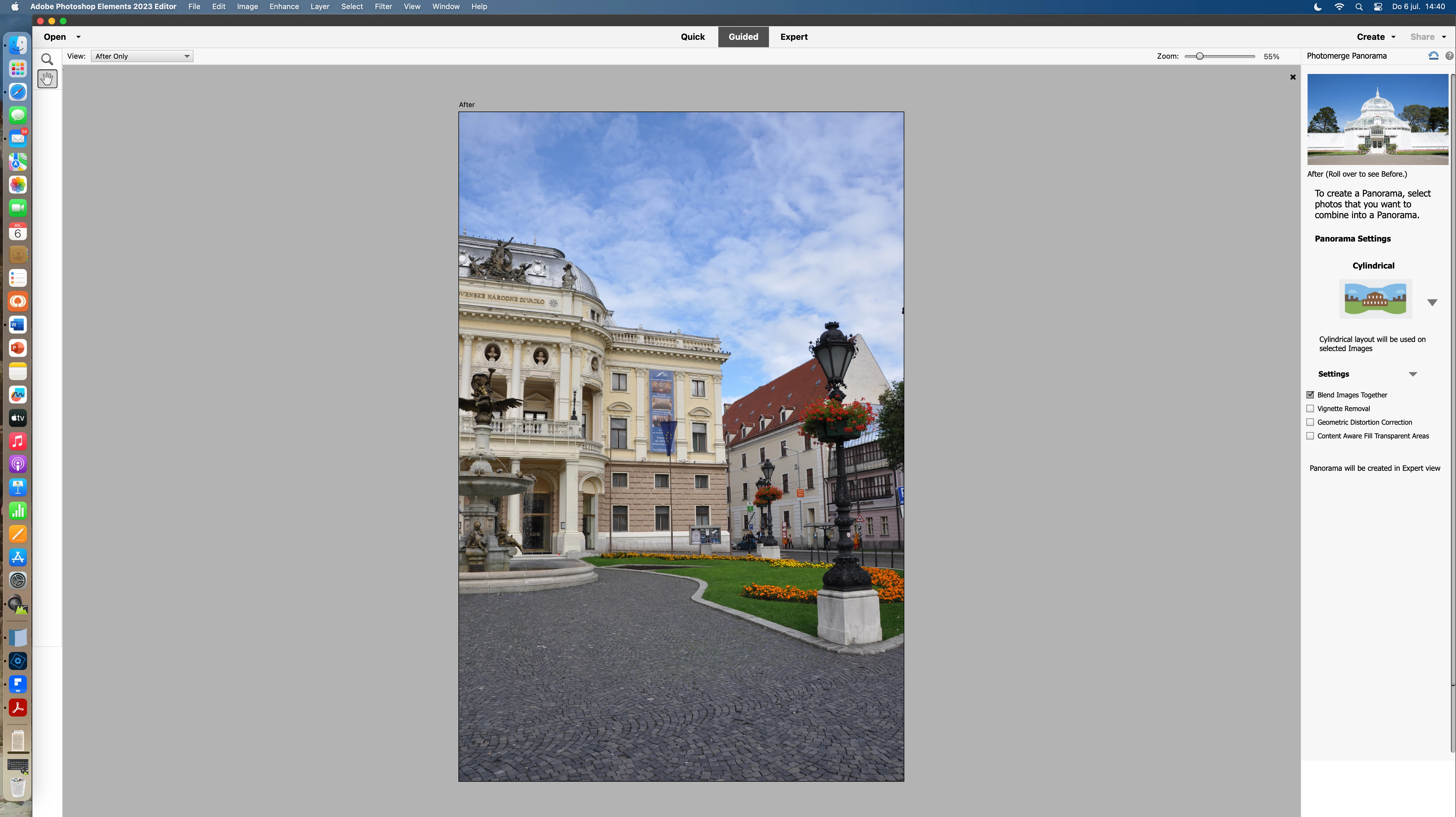 Since I have Adobe Photoshop Elements 2023 (on a iMac M1, with macOS Ventura 13.4.1), stitching photos with Photomerge Panorama is not possibe anymore. I follow the right steps, starting with opening the selected photos in Editor, then going to Guided > Photomerge > Photomerge Panorama and chosing the options and settings. The problem is: on my screen I see only one of the selected photos as a preview of the result "after", and the bar at the bottom with the button "create panorama" is not visible (nor the photo bin).