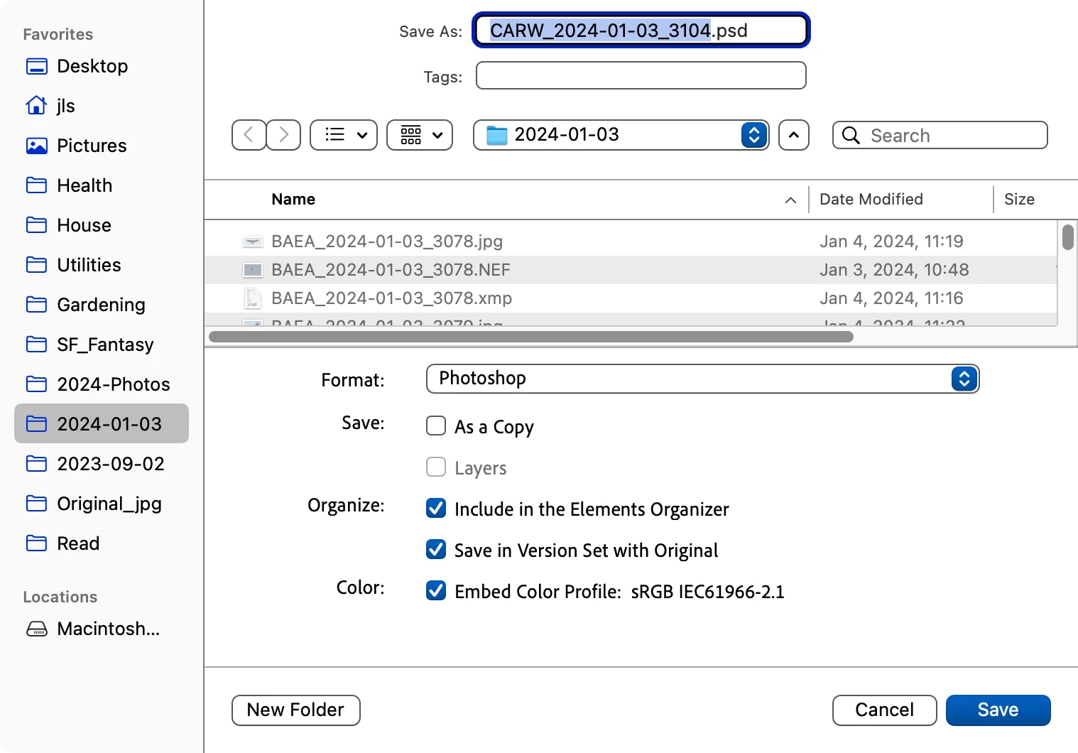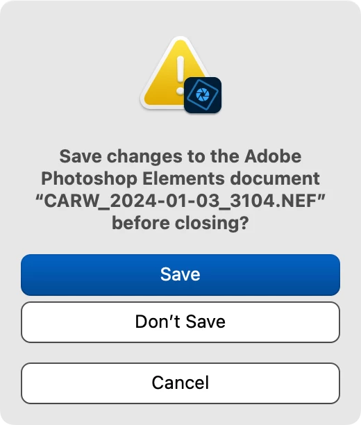 I just installed Photoshop Elements 2024 on a Macbook pro running Sonoma 14.1. I'm seeing some differences from the version I was using previously (2020). When I try to do a SAVE AS, the save window ignores the previous SAVE AS setting (almost always jpeg) and opens with Photoshop option. After I change this, save the file as a jpeg, and try to quit, Elements insists on asking if I want it to overwrite the original file.