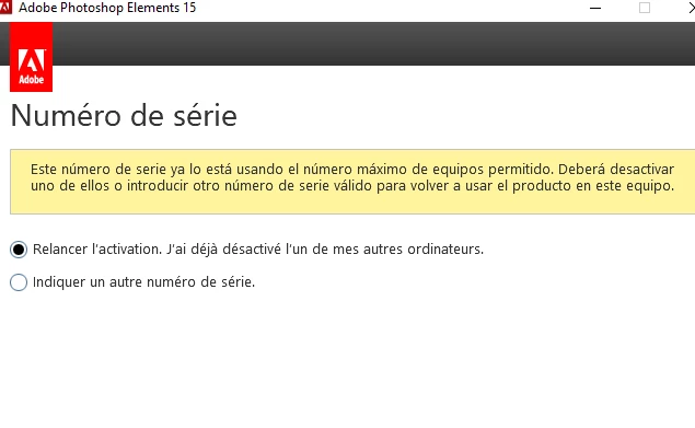 bonjour tout le monde, j'ai changé de PC il y a quelque mois, j'ai installé mon photoshop element 15 qui fonctionnais bien jusqu'à aujourd'hui, et d'un coup il s'est mis à beuguer, j'ai donc désinstallé et réinstallé et je reçois un message en espagnol (il me semble comprendre que mon produit est enregistré trop de fois) je ne parviens pas à faire l'étape suivante 😞