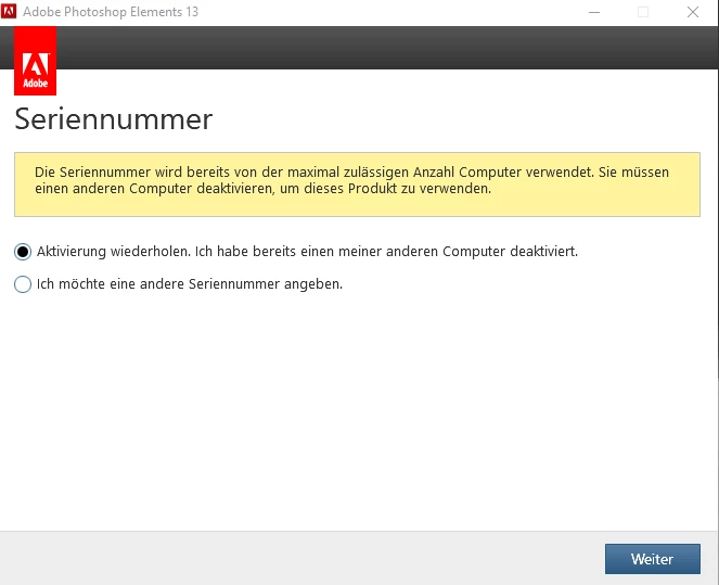 ich habe mir einen neuen PC zugelegt, und mein altes Adobe Photoshop Elements 13 installiert. Beim Starten des Programms öffnet sich allerdings jedesmal ein Fenster, dass die maximale Anzahl der angemeldeten Computer bereits erreicht ist. Dennoch kann ich das Programm normal nutzen. Wenn ich über den Browser auf meine Adobe ID gehe, kann ich unter dem Reiter "Abos und Zahlungsoptionen ----> Aktivierte Geräte" keine Einträge finden. Weiss jemand vielleicht, wie ich diesen Fehler wegbekommen kann?
