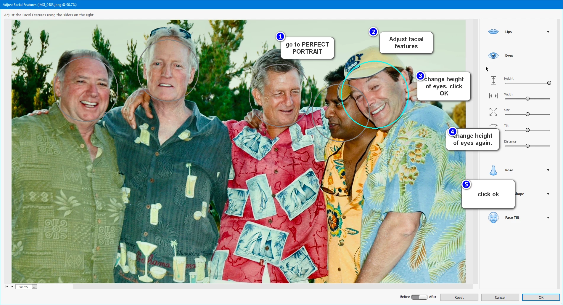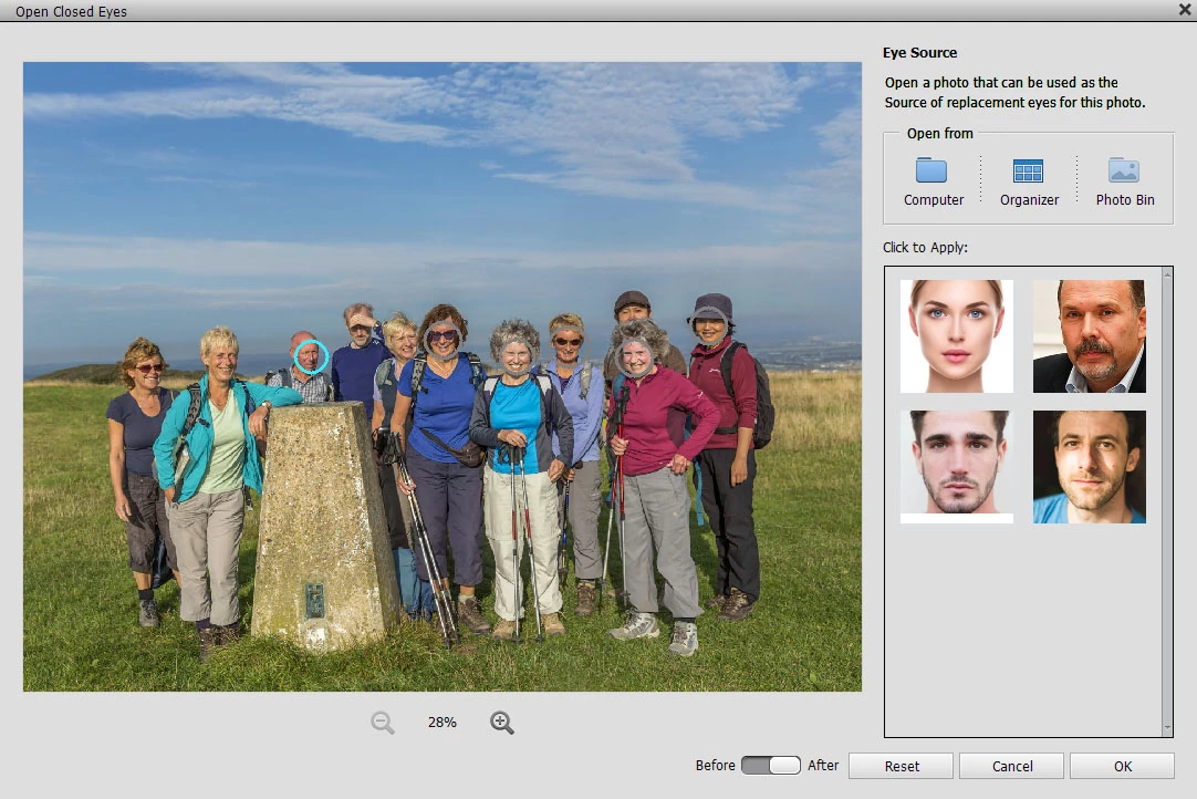 If a group photo contains people with closed eyes, the software normally highlights all of them with the main focus highlighted in blue and the others highlighted in gray – see image below. Clicking any gray circle changes the focus to that persons face.