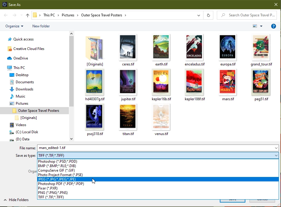 I am converting an image from the tiff format to jpeg using Save As. In the past the program would automatically add the extension. But now I have to erase tif and type in jpg. This appears to work, but I think it should be automatic.
