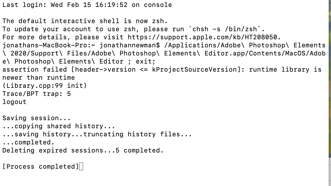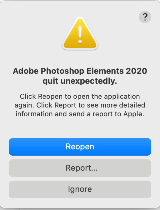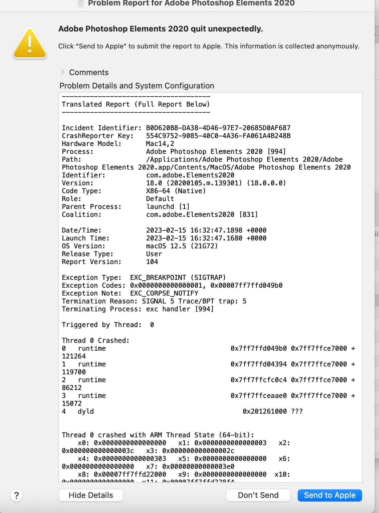 I recently bought a Macbook Air M2 2022. It is running Monterrey 12.5. I installed my time machine back up, and all seemed good. Until I tried to launch Photoshop elements (which I purchased and ran fine on the previous macbook pro). Every time I try, I get 'Adobe P Elements 2020 quit unexpectedly). I've tried running from the application finder and the same happens. I ran some trouble shooting suggested on another thread. Help!