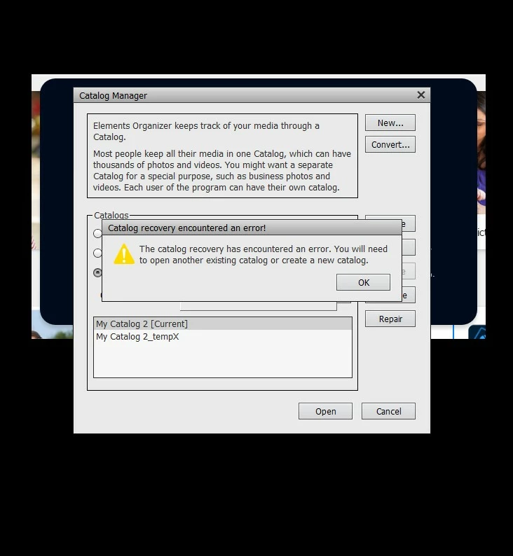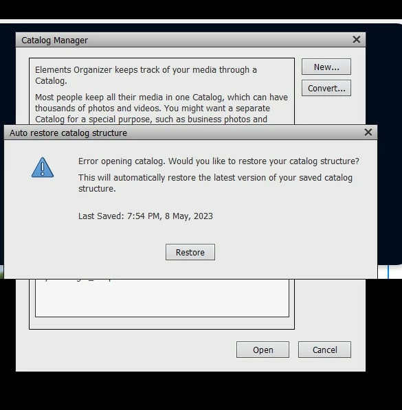 I have a large collection of photos (50k) in PSE2022 that I have been using for over a year on my Windows10 desktop computer, with multiple disks. Recently I added some photos to the collection and did some reorganising of the photos using PSE, then did a full backup. When I next started Organizer I received the message that there was an error opening Catalog (see screenshot PSE Error 1). I have three full backups on another disk. The recovery did not work either (see screenshots PSE Error 2 and 3). When I open Organizer now I get screenshot 4.