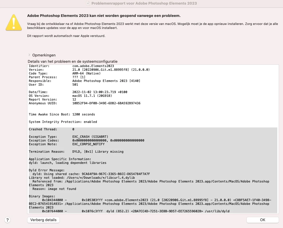 Photoshop Elements 2023 crashes by startup with macOS Big Sur 11.7.1 (Mac mini M1)