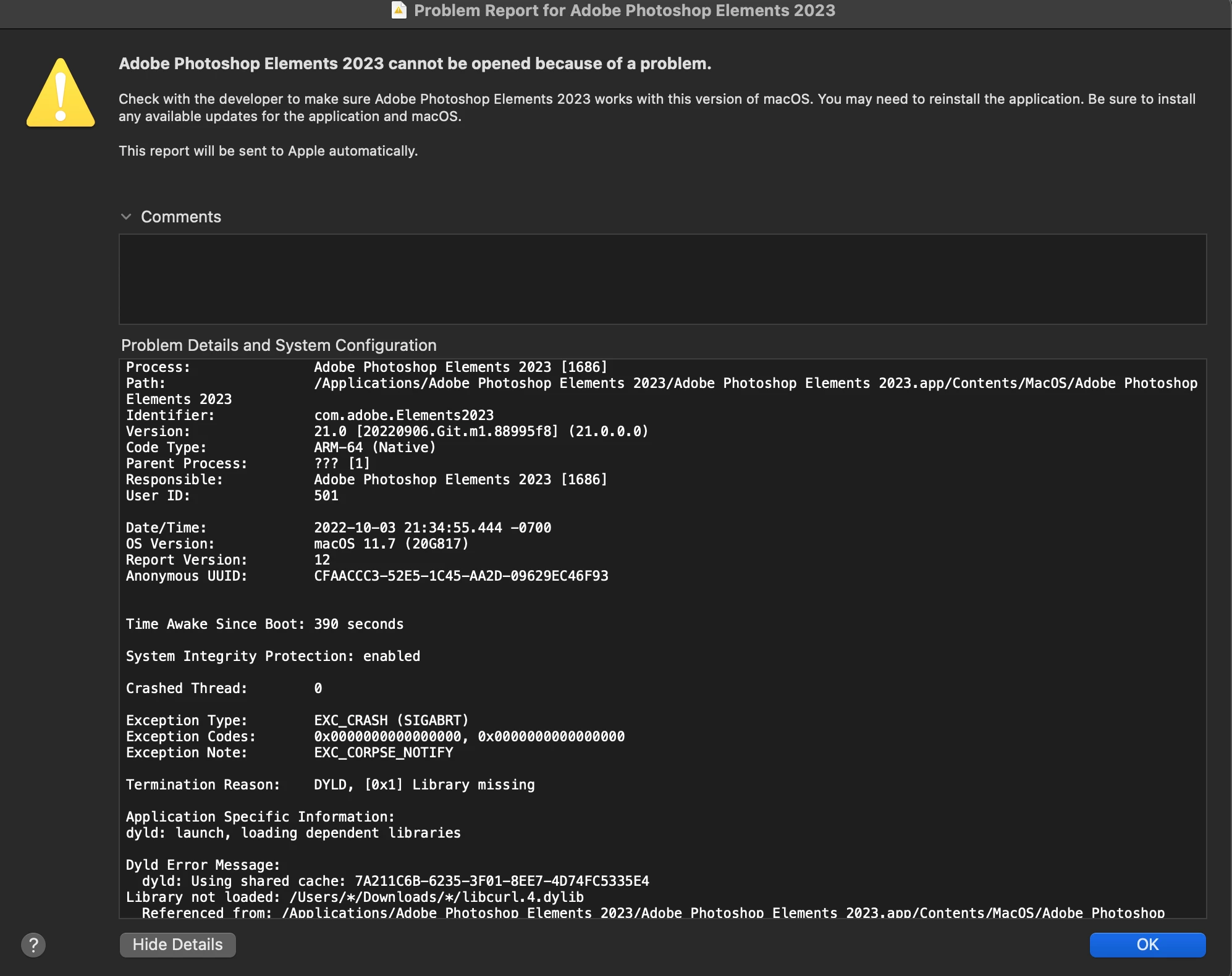 Hello. I just purchased PSE 2023, and it consistently crashes during the latter part of installation and upon launch w/ the error log as attached. Not sure why libraries would be missing. I'm running MacOS 11.7, and I'd really prefer not to install MacOS 12. I had uninstalled a demo version of PSE 2020 prior to installing PSE 2023. I've also tried unistalling and re-installing PSE 2023. Thanks in advance for any assistance.