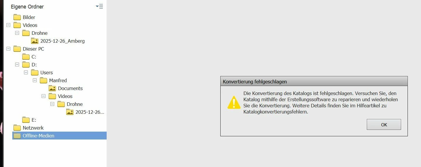 “Die Konvertierung des Katalogs ist fehlgeschlagen. Versuchen Sie, den Katalog mithilfe der Erstellungssoftware zu reparieren und wiederholen Sie die Konvertierung. Weitere Details finden Sie im Hilfetext zu Konvertierungsfehlern.”