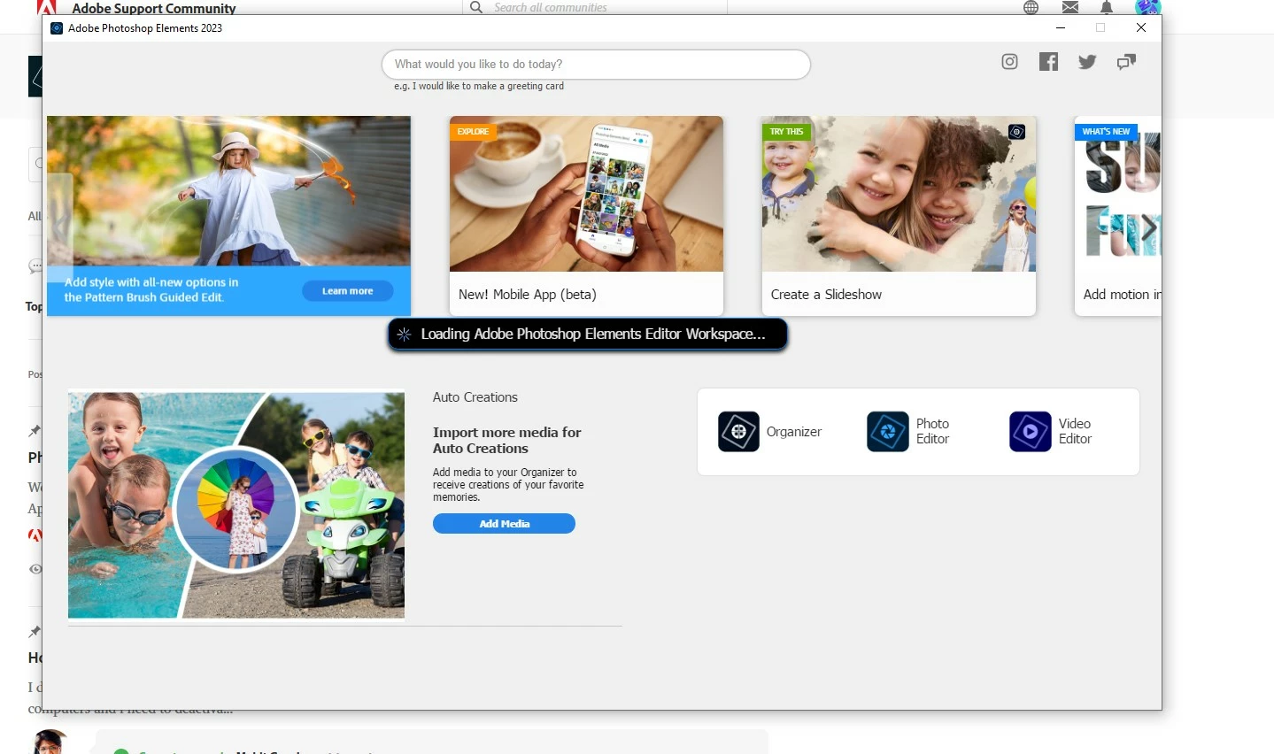 I just downloaded Photoshop Elements 2023, and it looked like it installed fine. I can open Organizer workspace and import my photos but when I click Photo Editor, nothing happens. A box opens in the center of the screen so say "Loading Adobe Photoshop Elements Editor Workspace" (see attached screenshot) but after a couple of minutes the box disappears and nothing happens. I don't see the Editor workspace. I've uninstalled and re-installed to no avail. Any suggestions?