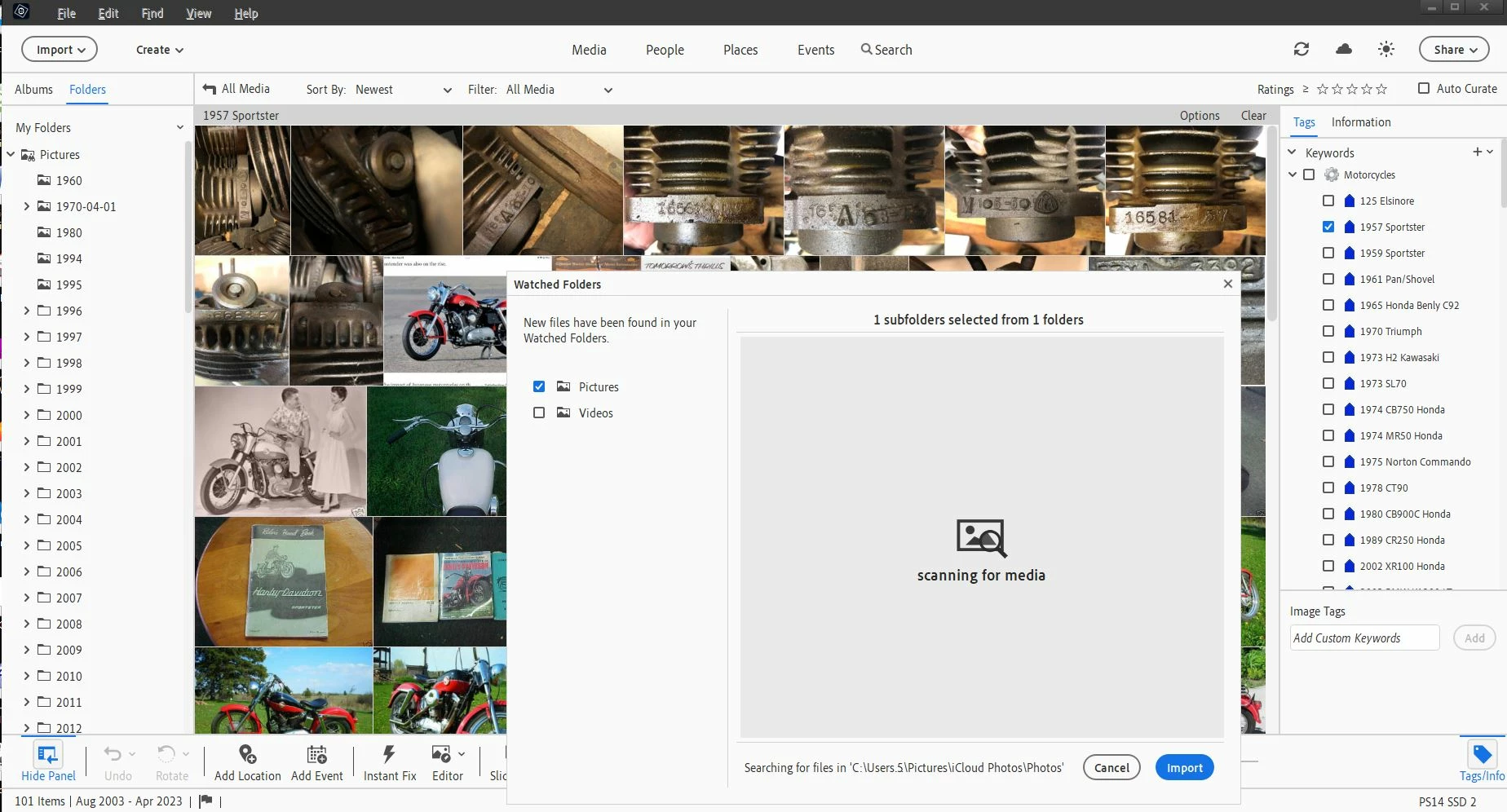After clicking "Organizer" on startup page, scanning for media dosen't stop unless/until I click "Import". After clicking import , it does seem that all the pics it displays are new. Also, I forget what I did but it does finally recognize my iPhone pics (.heic). All my previous versions of PS would find all the new pics in the watch folders, display only them, and I would choose to keep or delete, etc. Can anyone help with this?