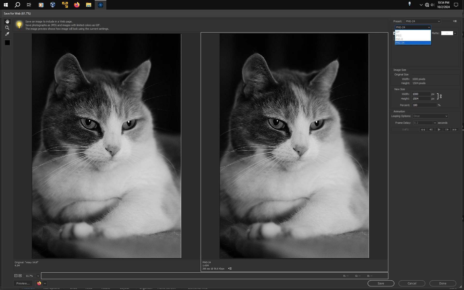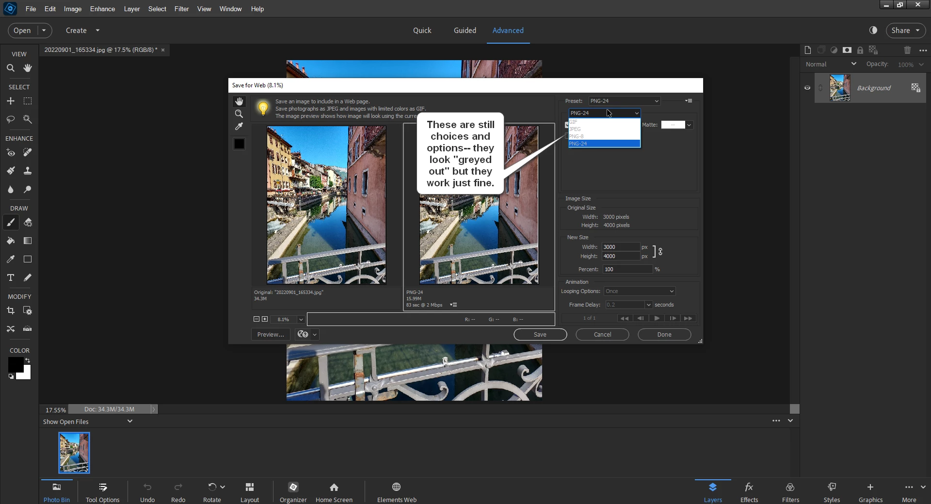 Photoshop Elements 2024, not allowing save for web in any format except JPG