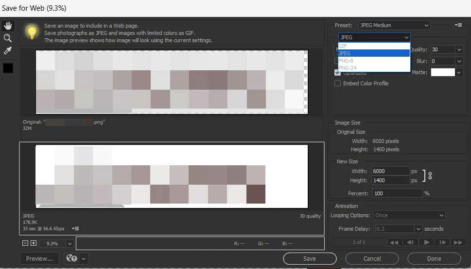 - Even if I save it PNG first, the save for options do not include PNG. See example below. Image has been blurred to hide client information.