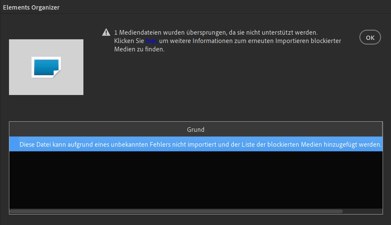 Photoshop Elements 2024 Organizer stürzt beim Importieren von mp4 Dateien unregelmäßig ab. Egal, ob im Stapel oder bei einzelnen Dateien. Entweder, es wird ein Fehlerbericht erstellt oder es erscheint folgende Meldung: