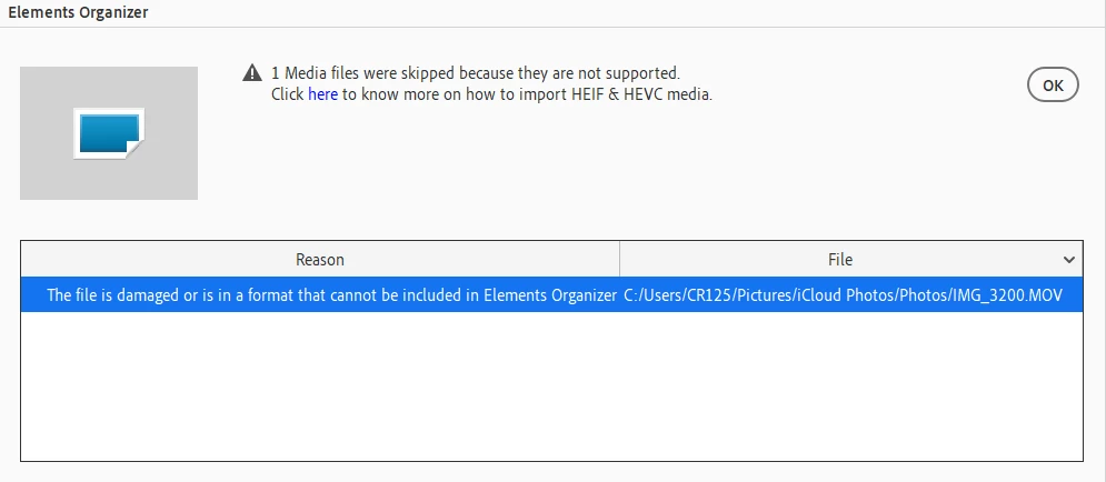 Photoshop Elements 2024 Premiere won't open all my .mov files