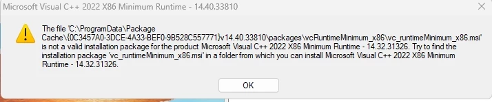 The installation process (on WIN11) said that it could not find this file: vc_runtimeminimum_x86.msi, apparently an older C++ MS package.