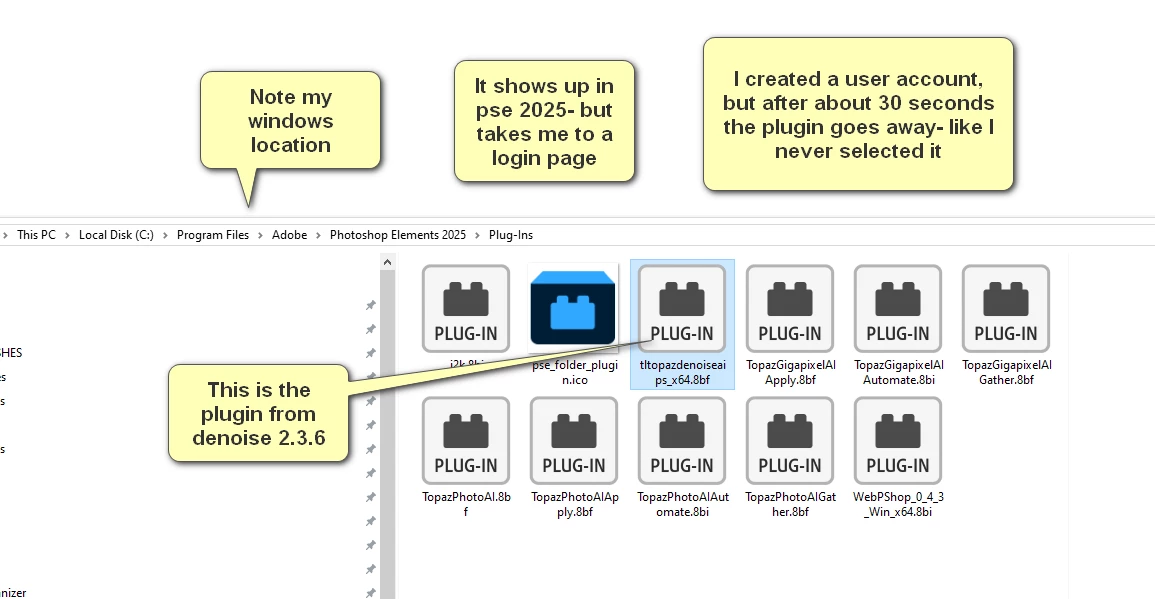 I have downloaded a trial copy of Photoshop Elements 2025. I currently use PE 2019 with a Topaz Denoise plugin. I have been unable to get PE 2025 to see the plugin. When I click on the Topaz Pugin in the PE drop down menu (beacuse it does appear there), I get the message