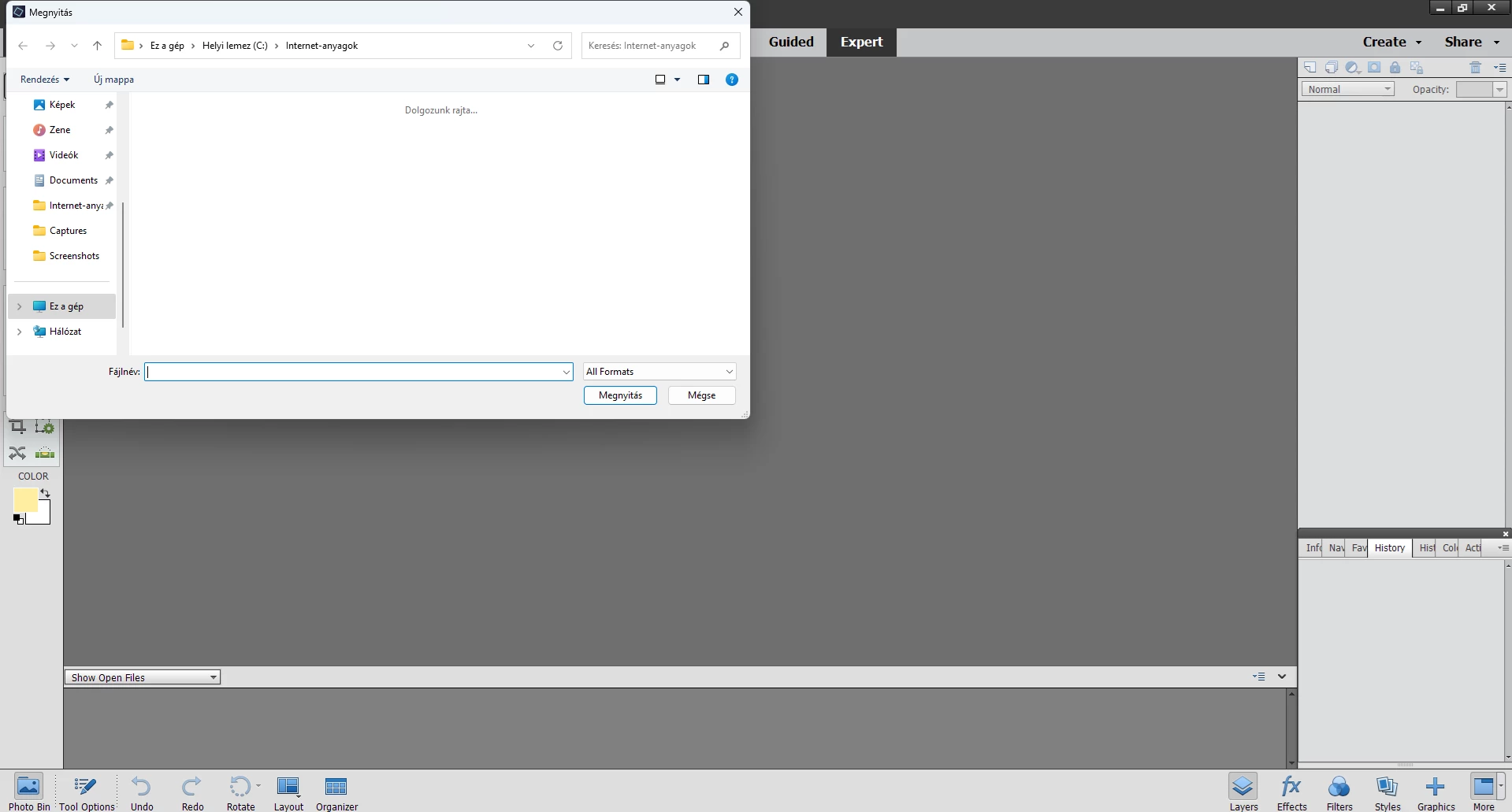When trying to open a file via the Open button, the software can't load the folder/file structure, it simply locks up and becomes unresponsive. The message "We're working on it..." is displayed in the file window but nothing else happens. The only way to shut it down is via the Task Manager. I tried reinstalling the software, as well as installing other editions of Photoshop, including the trial versions of 2024 and 2025, but they all exhibit the same issue. They all lock up when trying to open a file.
