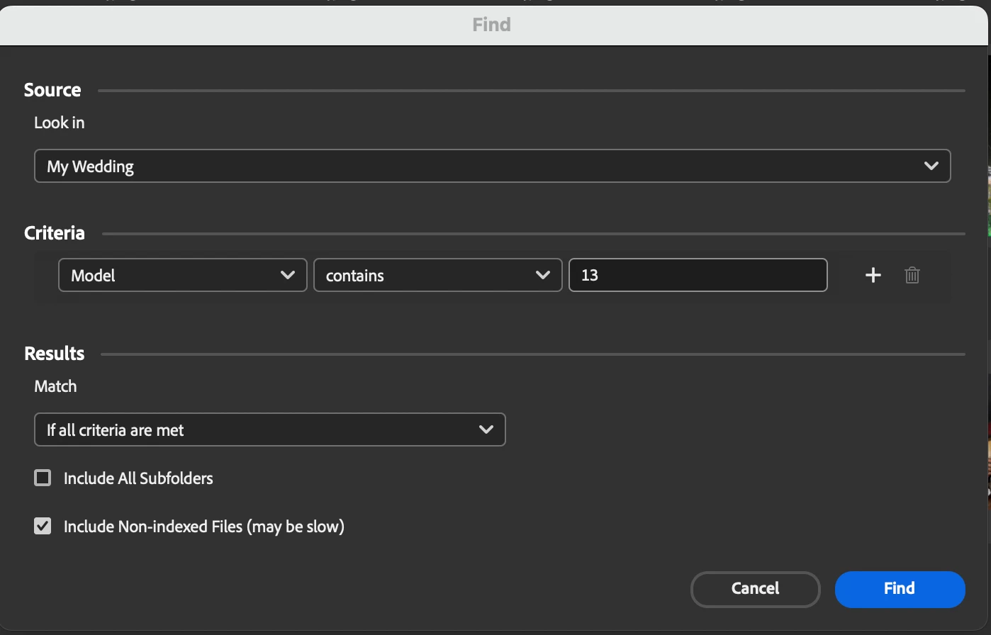 Find by Details where “Camera Model CONTAINS 13” AND “Folder Name IS My Wedding”