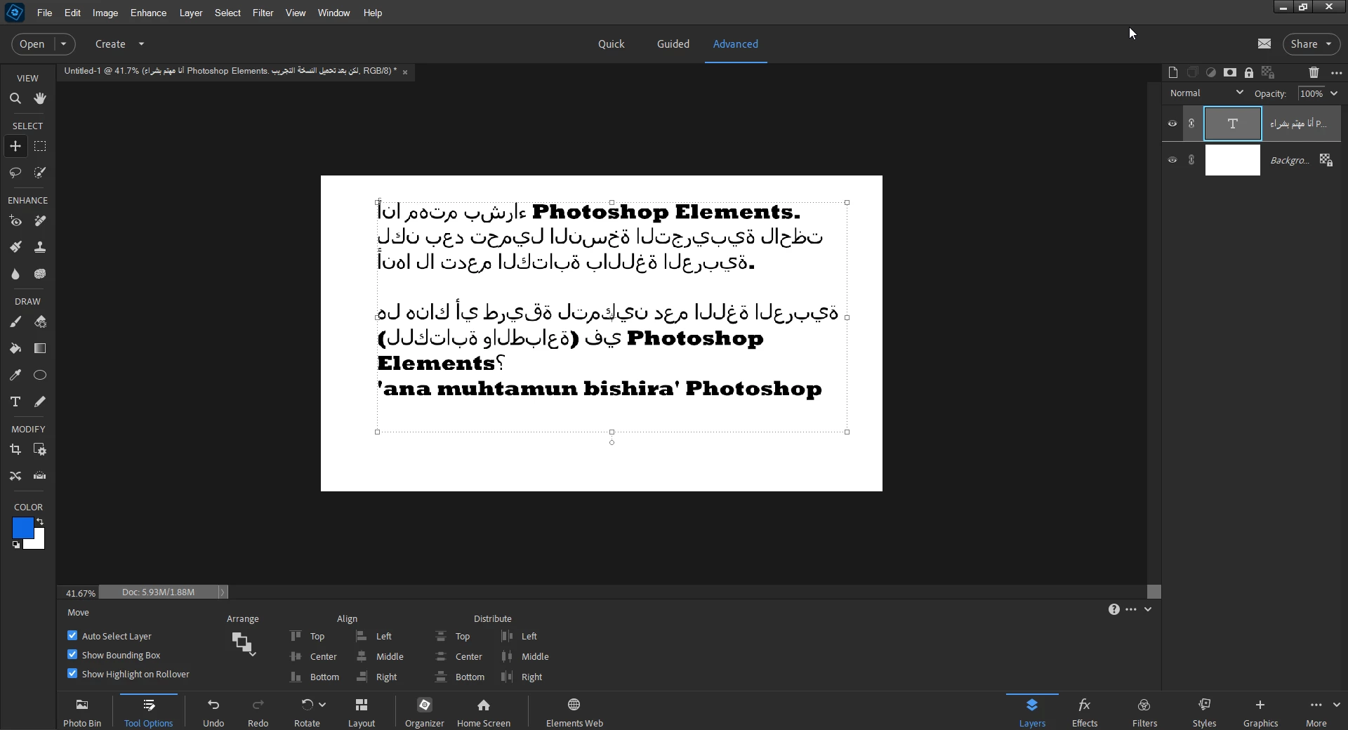 I am interested in purchasing Photoshop Elements. However, after downloading the trial version, I noticed that it does not support writing in Arabic.