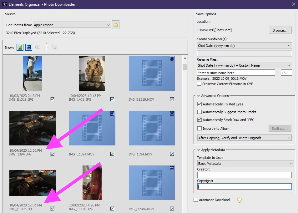Photoshop Elements Organizer - Photo Downloader sorts the items by modified date instead of created
