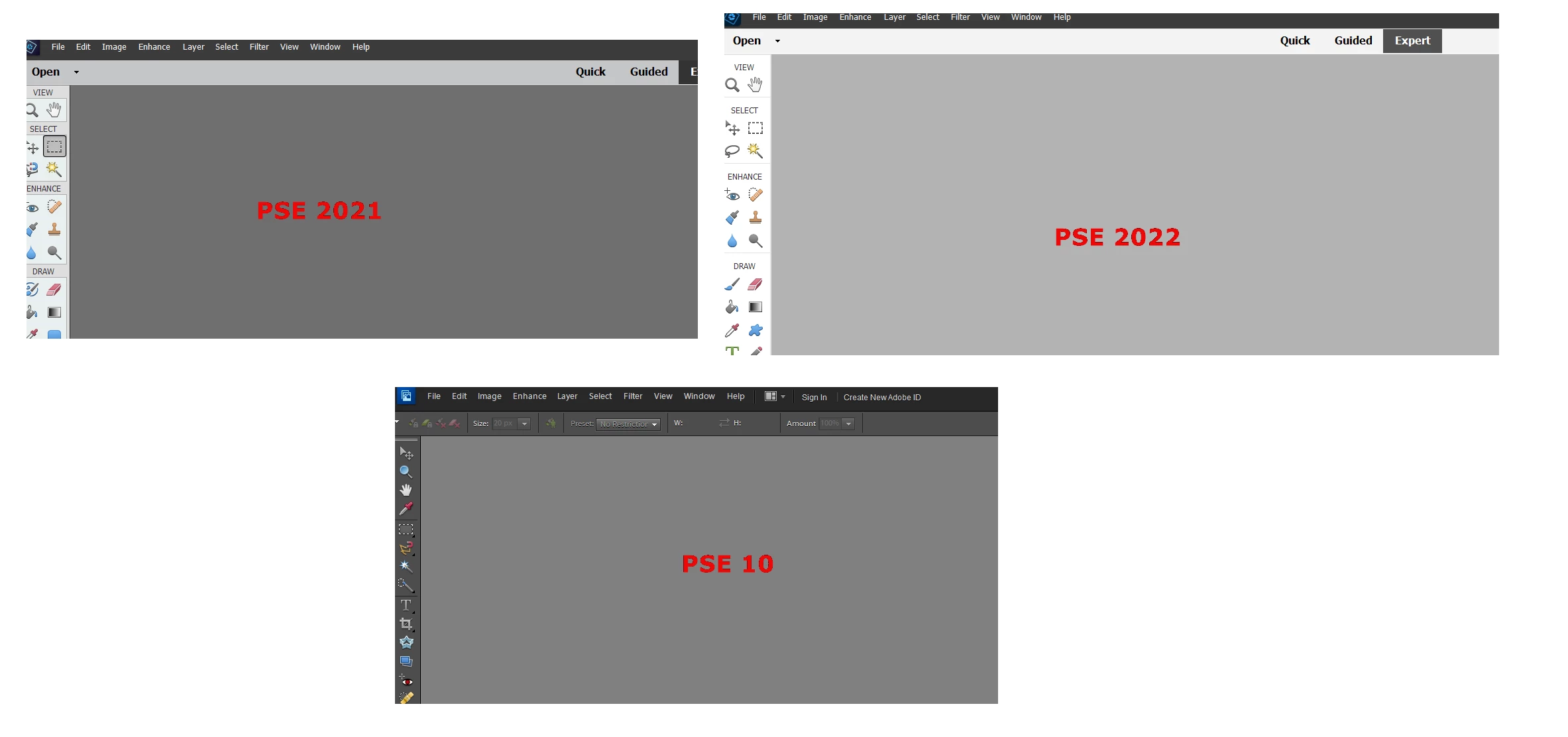 I am new here, and I recently downloaded the trial version of Photoshop Elements 2023, but I am not happy with the interface being white. It is really hard on my eyes at night. know that there are older versions that have dark gray/green interfaces. It doesn't seem like there is a way to change it to a darker color. What version of Photoshop Elements was the last one that was that dark gray/green?