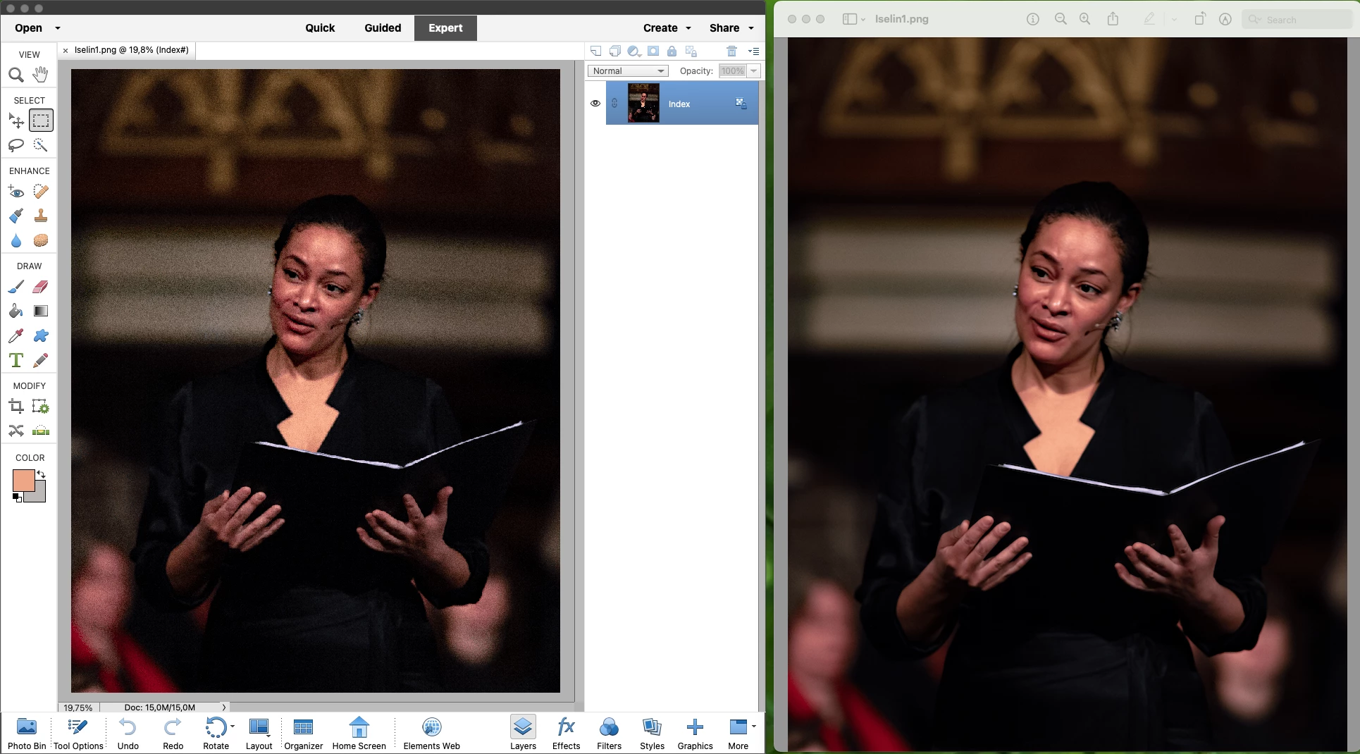 This was very strange, so I contacted DxOLabs support. But without much help. Their representative kept asking silly questions and told me to do things that really didn’t lead to anything 😞 Thus my hopes were high when another release of Nik Collection (6.5) came out, and I tried upgrading again. Now my system seems to have become haunted by "randomness": Sometimes when I launch Photoshop Elements I can actually carry out some regular photo editing, but most times even the basic image rendering within Photoshop Elements has become distorted – phots are displayed far more coarsely than they actually are! (see illustration below).