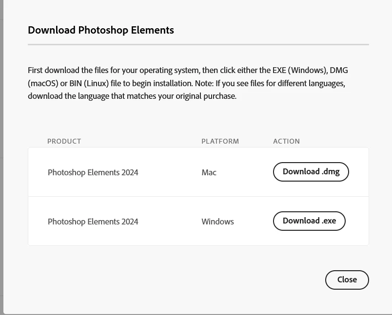 A few years ago I purchased Photoshop Elements version 19. When I purchased it I loaded it to a PC. Now I have a Mac. Am I able to download it onto my Mac? When I sign in, I have all the licensing info and such. Download only shows Windows.