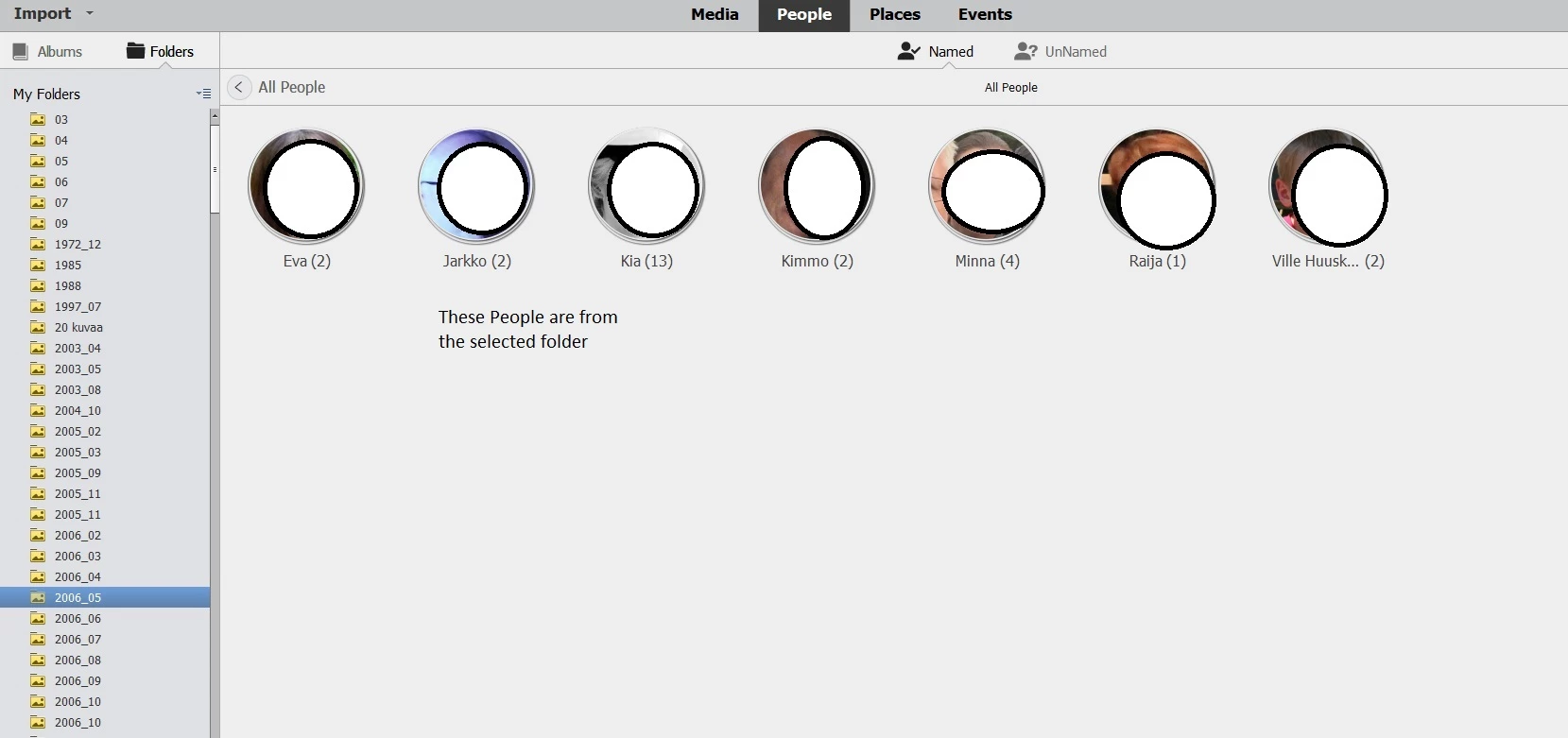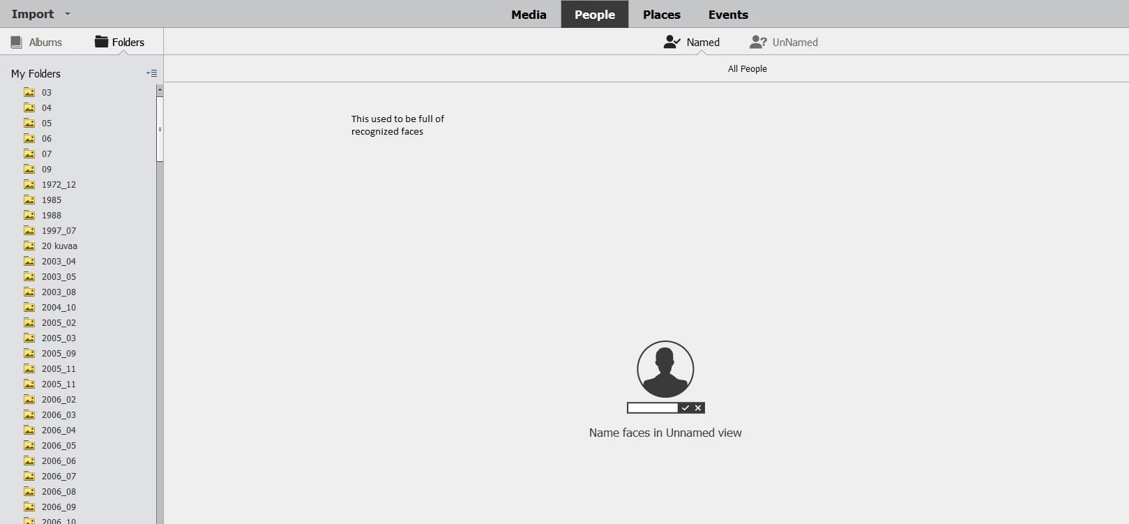 I have Photoshop Elements 2020 Organizer. All face recognition data has been lost from the People tab. Places and Events data is still under the corresponding tabs. However, if I click folders on the left, there will be Named People shown from that particular folder. So there is People data but it is not shown unless a Folder is selected. Before all Named People were shown under the Named People tab. If I try to repair catalogue, I will get an error message Catalogue could not be repaired. Searching people does work so the data is somewhere. I don't have a backup of the catalogue.